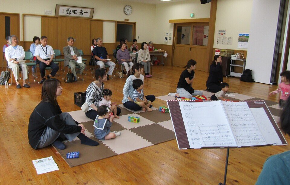 「ぞうさん」の曲では、小さな参加者さんのかわいい歌声が聴こえてきました。「手をたたきましょう」「犬のおまわりさん」など8曲が続き一緒に手をたたいたりしながら楽しみました。