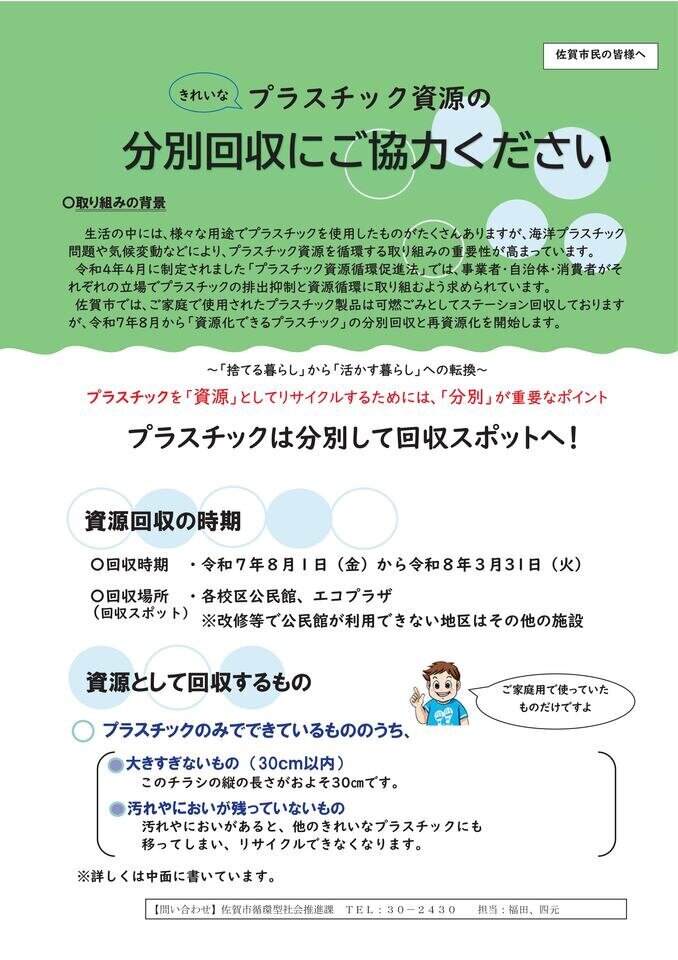 令和7年8月1日から「【きれいな】プラスチック資源の分別回収」が始まっています。