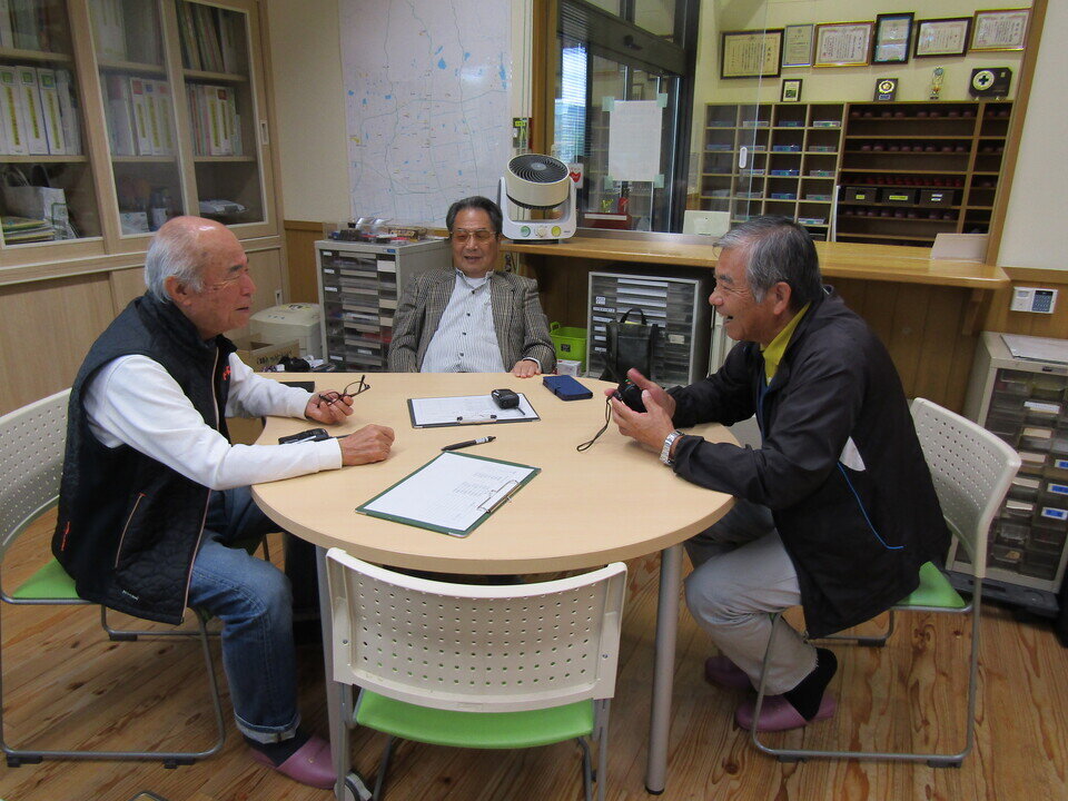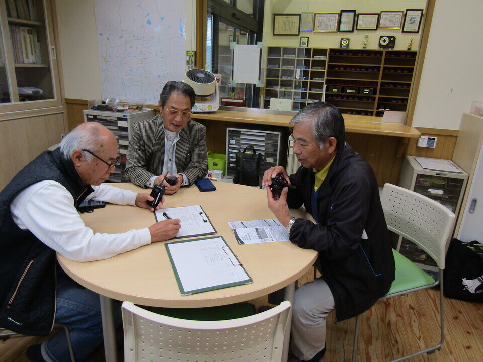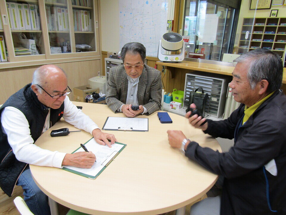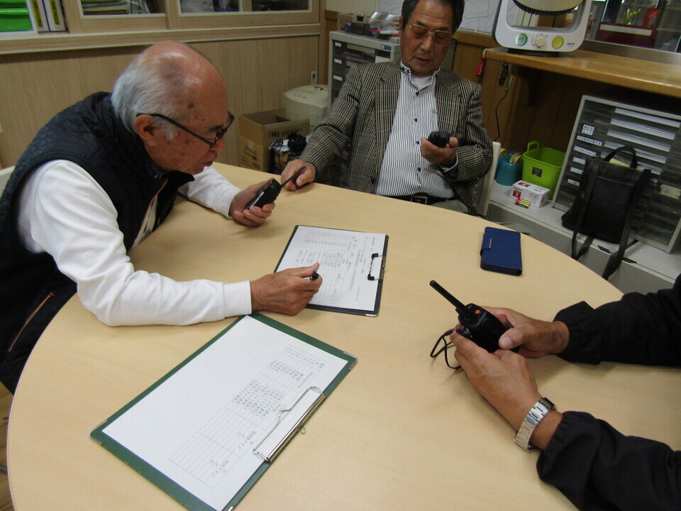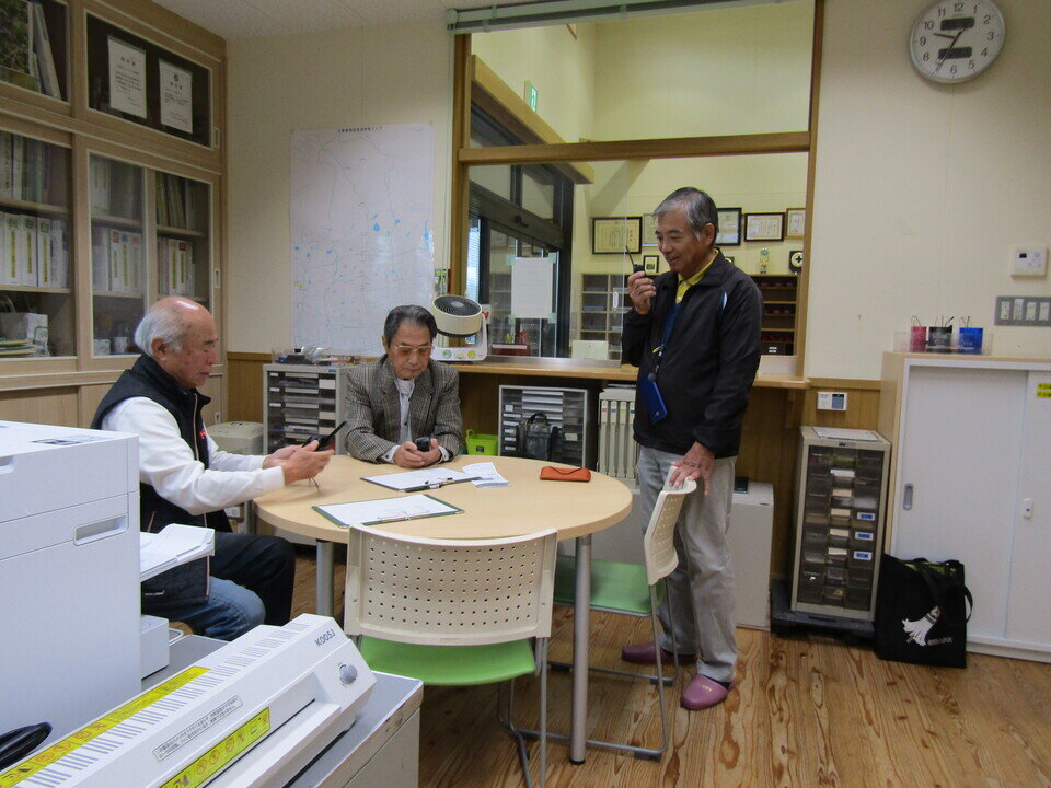 デジタルとアナログの真ん中のようなトランシーバーを使って久保泉公民館事務室を防災本部として