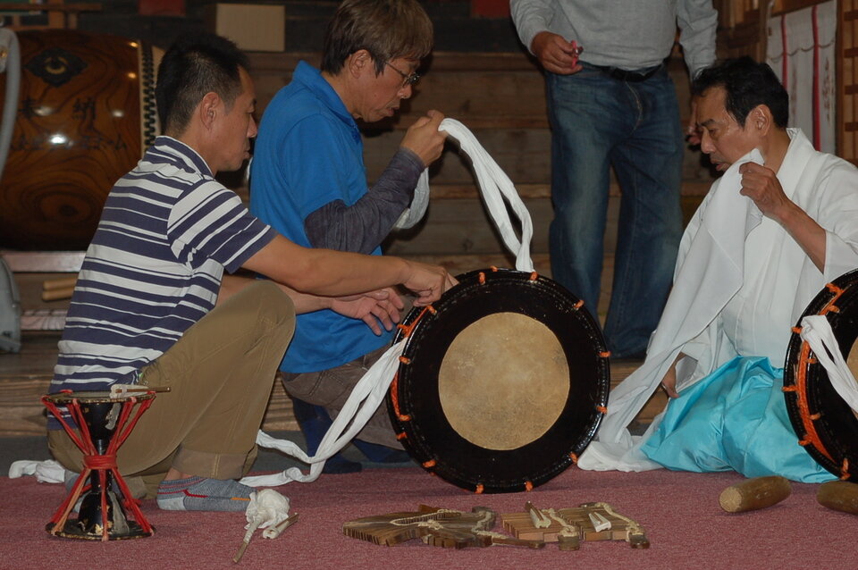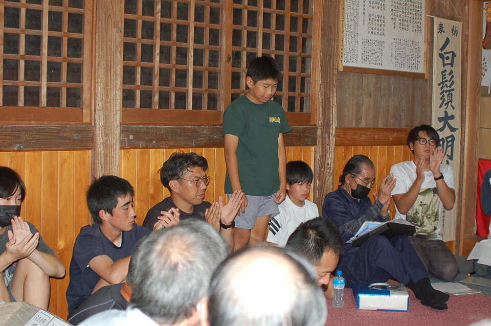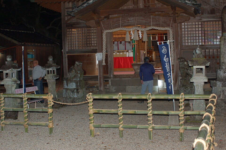 毎年、10月18日と19日の両日、佐賀市久保泉町川久保の白鬚神社境内において、稚児田楽が奉納されます。本番のちょうど一週間前の11日20時から練習開始が慣例です。