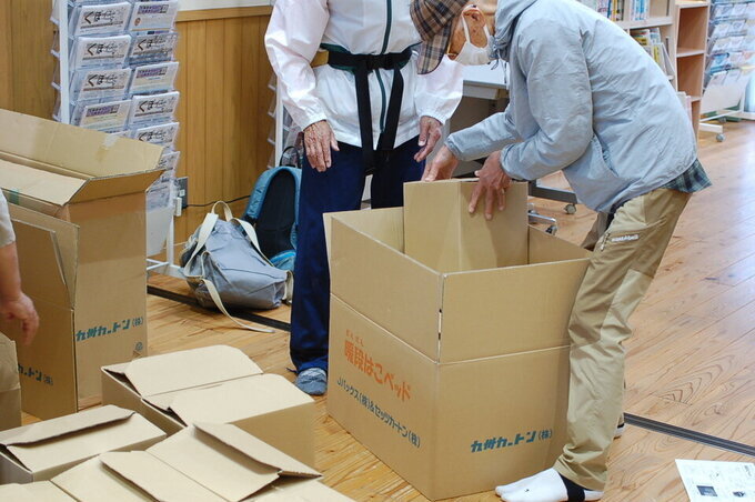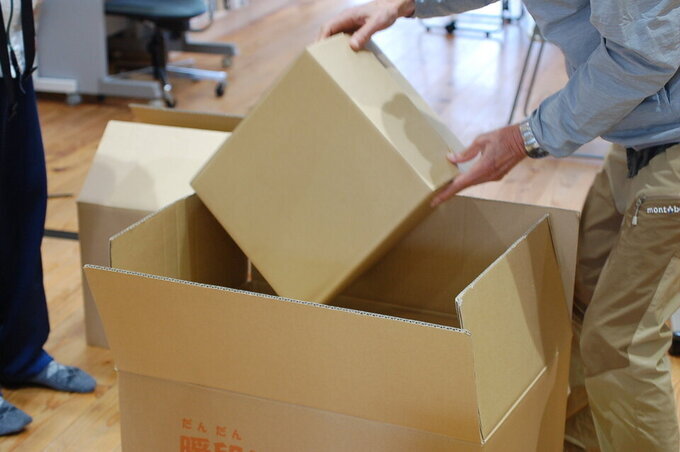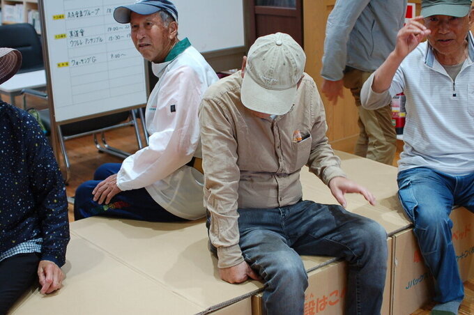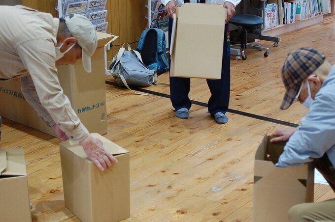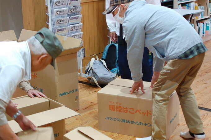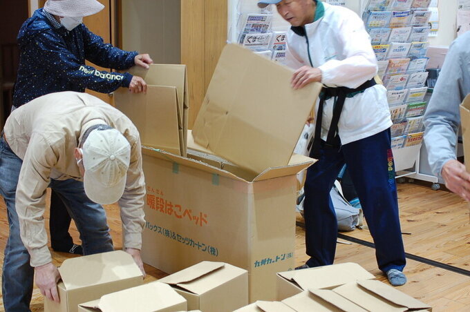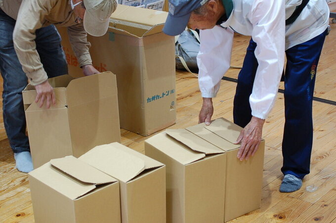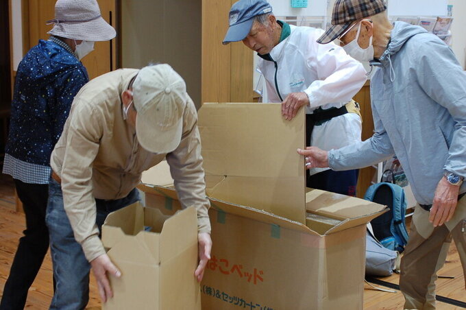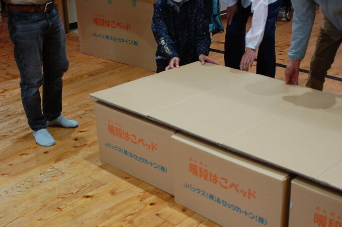 ここでは、「歩く」場面ではなく、「雨天時は中止ではなく違う取り組みをしていますアピール」として出展します。防災訓練のうちの「段ボールベッド作り体験」のようすです。