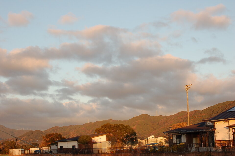 彦岳もりりしく。初日の出の画にも使えそうな陽光。輝くハウス。ぴかぴか。
