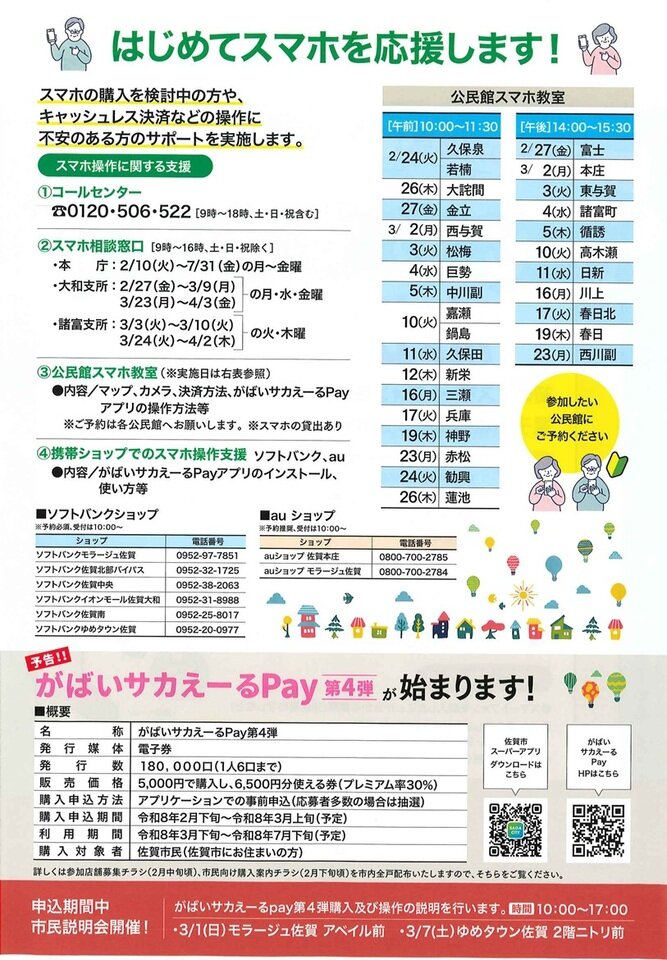 スマホの操作に不慣れな方へのサポートとして、佐賀市内の各市立公民館で携帯会社担当者が講師として教室を開催します。