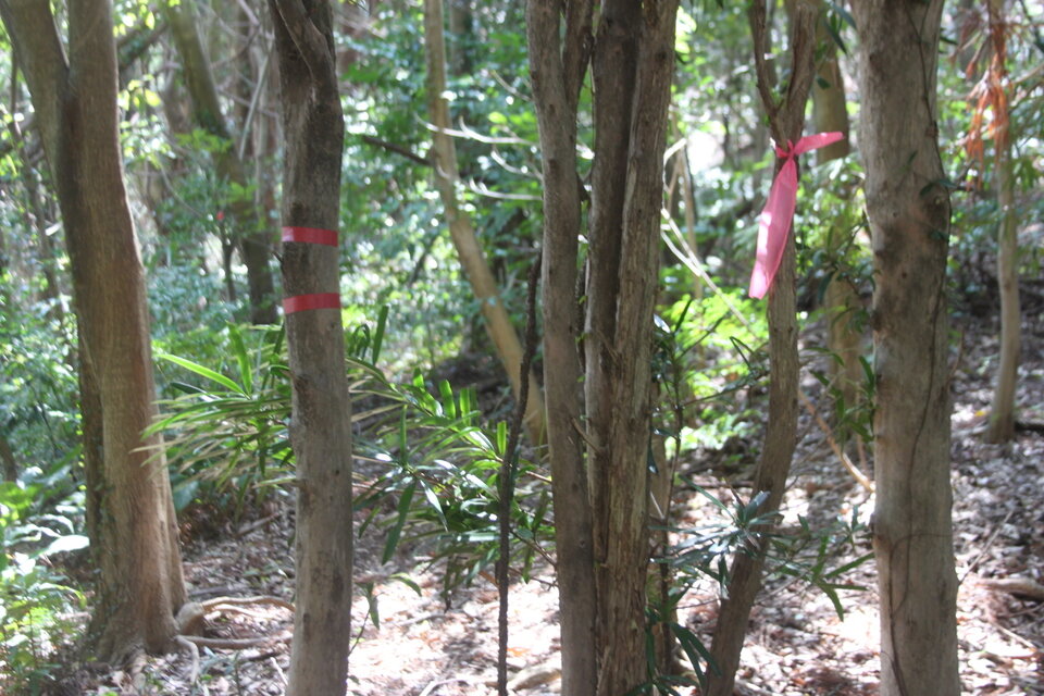 少し進むと山登りさんがよくつける「テープ目印」(左)、国土地理院の「ビニールテープ」(右)があります。