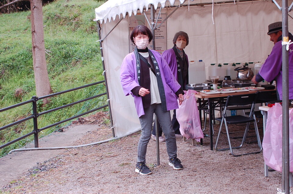 ぽつりぽつりの小雨模様の鳥越堤(下)下の駐車場担当のみなさん保全会会長さん