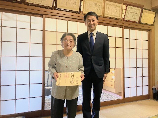 元久保田町長の故森賢一さん(1月30日死去、享年95歳)が従六位に叙位叙勲されました。 3日に坂井英隆市長から妻のキヌ子さんに書状などが贈られました。 森さんは1983(昭和58)年から町長を3期務めました。