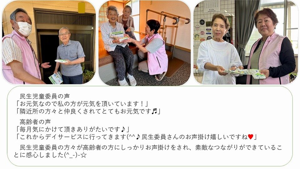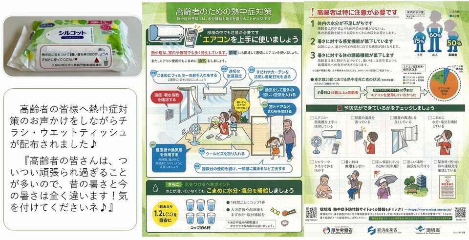 久保田地区民生委員児童委員協議会は、6月から7月上旬に「熱中症に気を付けてください!水分をノドが乾かなくてもとってくださいネ!」とチラシとウエットティッシュを持って訪問活動をされています。