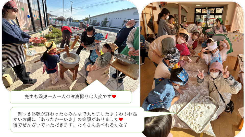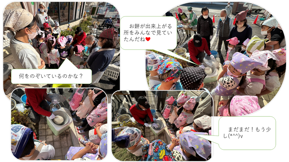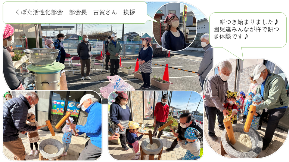 12/10(水)認定こども園くぼた保育園で餅つき会が開催されました。これは、久保田まちづくり協議会くぼた活性化部会が主催する事業で、地産地消の観点から久保田で収穫された美味しいもち米を使ったお餅を園児に食べてもらい久保田の良いところを知ってもらうことが目的です。