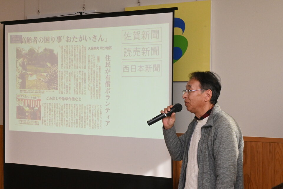 久保田校区社会福祉協議会の役員会が12月23日にあり、久保泉で活動している有償ボランティア「町分おたがいさん」について意見交換しました。中村秀二郎事務局長が、地区内で買い物や草取り、庭木剪定などで困っている高齢者家庭が増加していることから有償ボランティアを企画。サポーターを集め、活動に至るまでの経緯などを説明しました。意見交換ではサポーター集めの方法や、活動内容の詳細など様々な質問などが出ました。久保田校区社協も今後、このような有償ボランティアができないか検討を進めているところです。