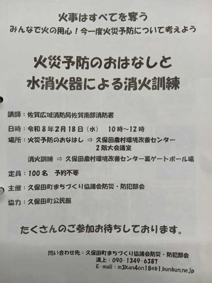 2月18日午前10時から久保田農業環境改善センターで、火災予防についての講演会と水消火器を使った消火訓練を行います。 定員は100人で、予約は不要です。気温が下がって国内では大規模火災が頻発しています。この機会に火災についての知識を身につけてはいかがでしょうか?