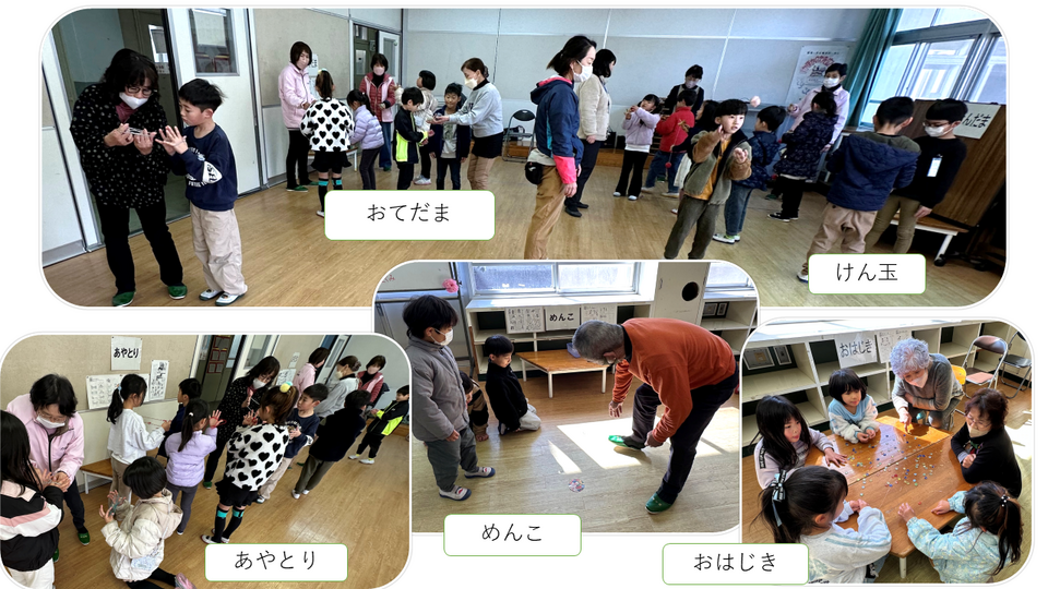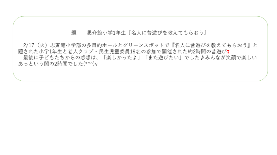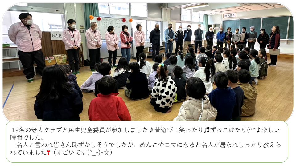 2/17(火)思斉館小学部の多目的ホールとグリーンスポットで『名人に昔遊びを教えてもらおう』と題された小学1年生と老人クラブ・民生児童委員19名の参加で開催された約2時間の昔遊び❣