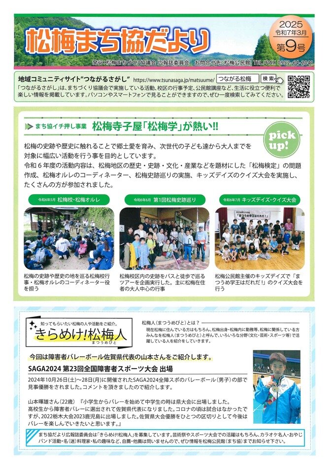 松梅まちづくり協議会広報誌委員会は、令和7年3月付け「松梅まち協だより」第9号を発行しました。 掲載内容は、 ○まち協イチ押し事業 松梅寺子屋「松梅学」が熱い!! ○きらめけ!松梅人 ○2024年のまち協イベントをピックアップ 松梅Photo通信 ○非常備蓄用の自動販売機の設置のお知らせです。