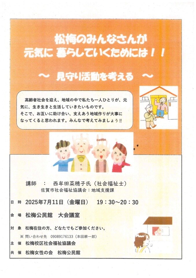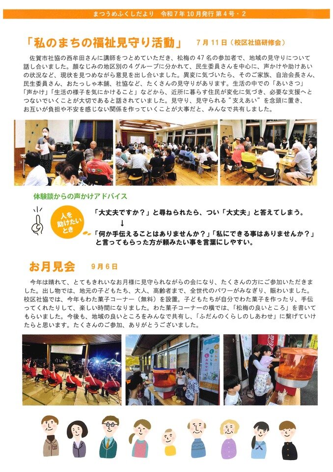 松梅校区社会福祉協議会(本田耕一郎会長)は、「まつうめふくしだより」(令和7年10月第4号)を発行しました。 掲載内容については、 ○通常総会の開催(4/30) ○「私のまちの福祉見守り活動」(7/11) ○お月見会(9/6)などです。