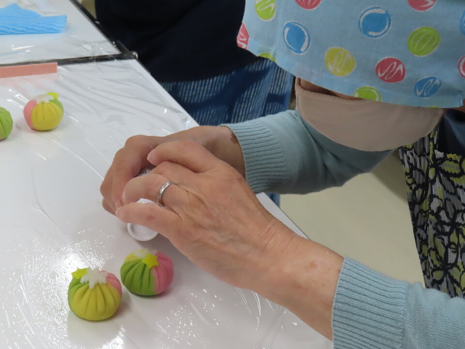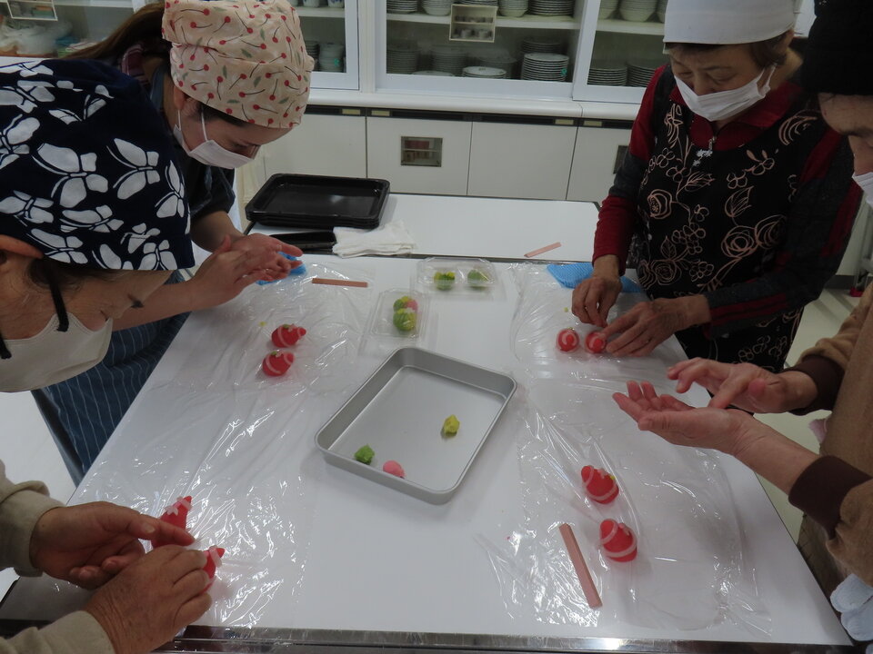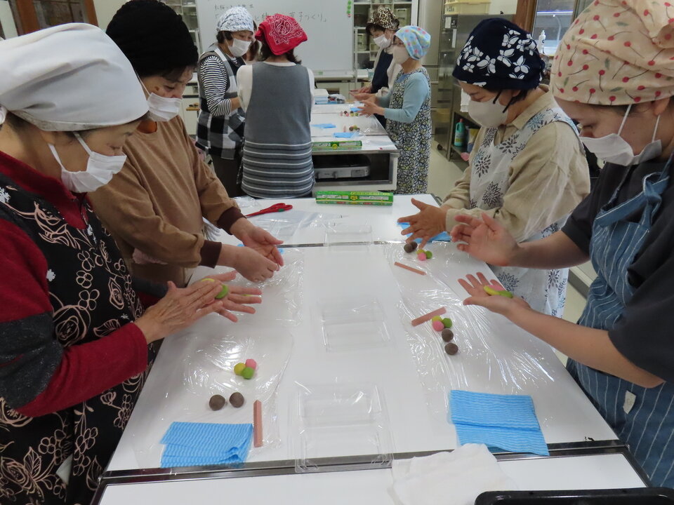 3色あんこを練って丸くし、飾り付けを行いました。皆さん童心に返り、楽しそうに