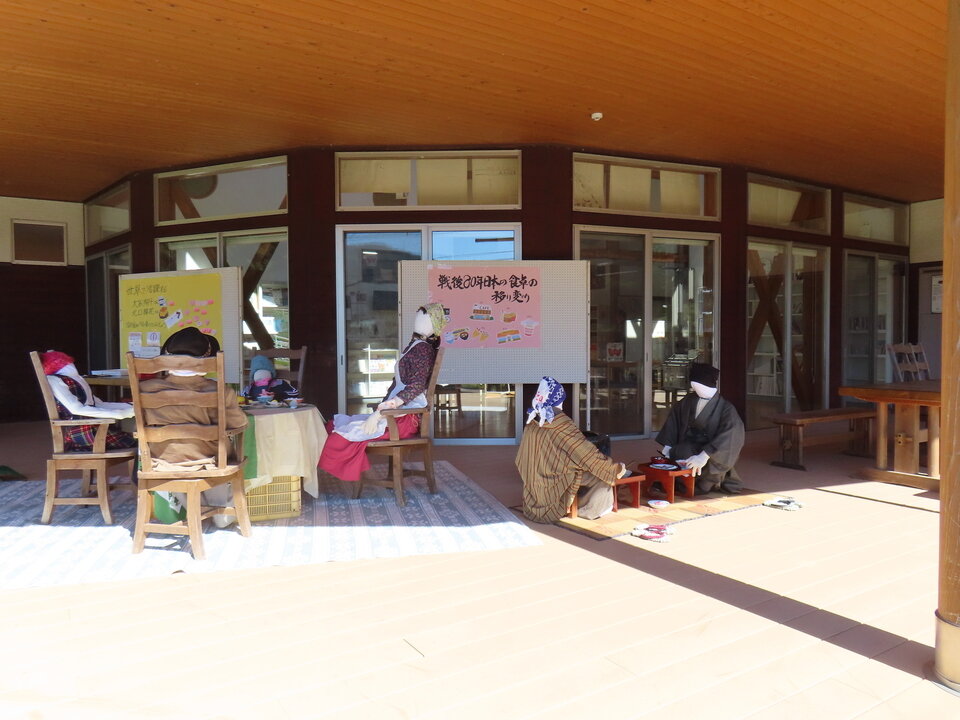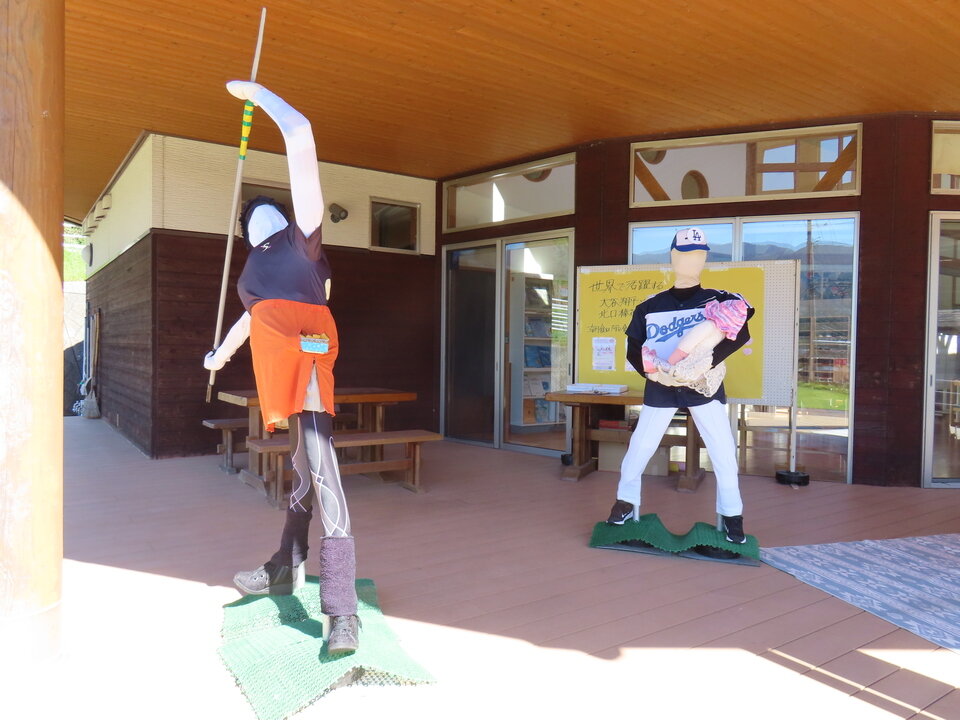 松梅公民館テラスには、松梅校区食生活改善推進協議会の皆さんが製作された食事中のかかし村人や大谷翔平、北口榛花のアスリートかかしが展示されています。