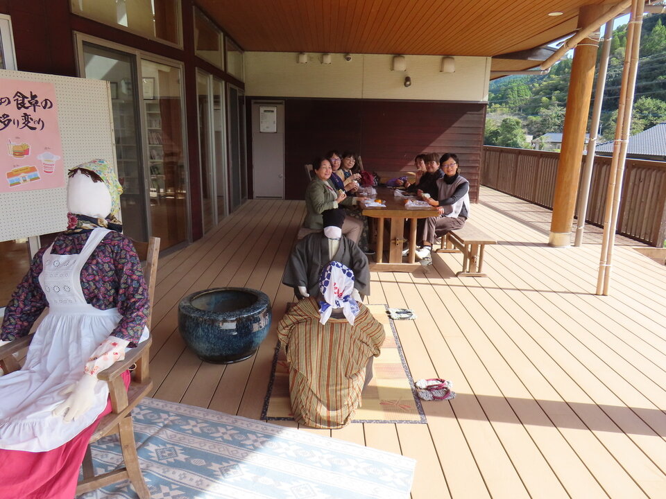 テラス隅には休憩用の長机と椅子が寄せられており、参観者の女性グループ6人がかかし村人と一緒に昼食をとられていました。穏やかな秋晴れの日中、かかし村人を横目に、さらには借景となる山々を見ながら、まったりとした気分で談笑するのも楽しいでしょうね。