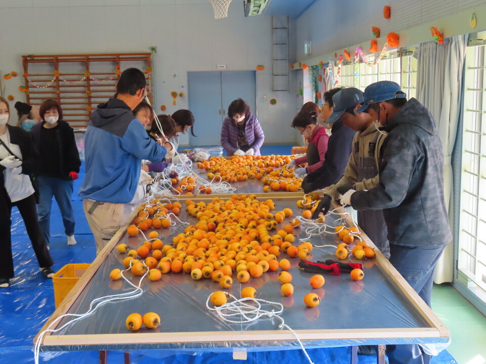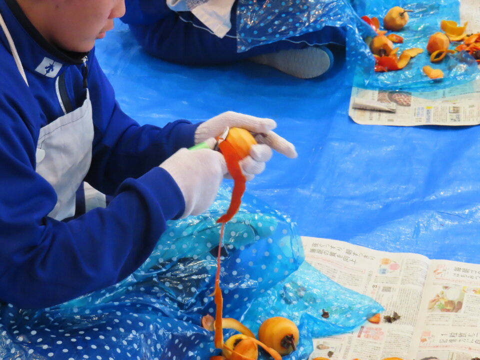 数日前に地域の「柿むき名人」の方々から柿むきの指導をしてもらった子どもたち。