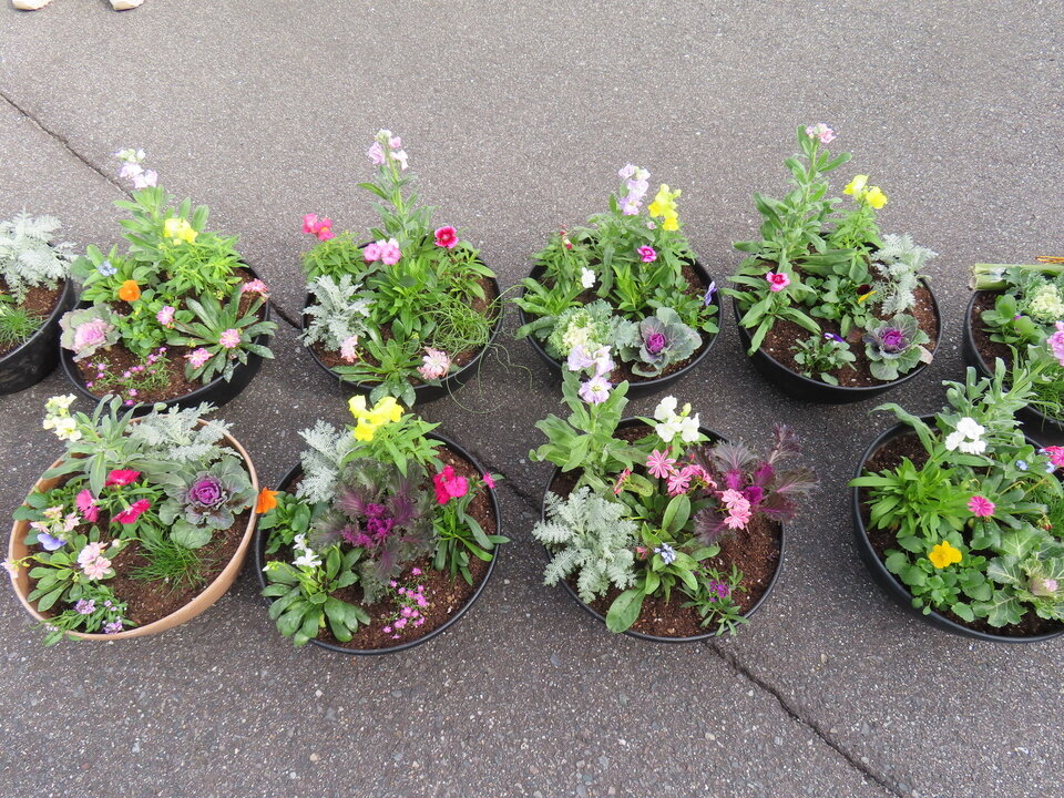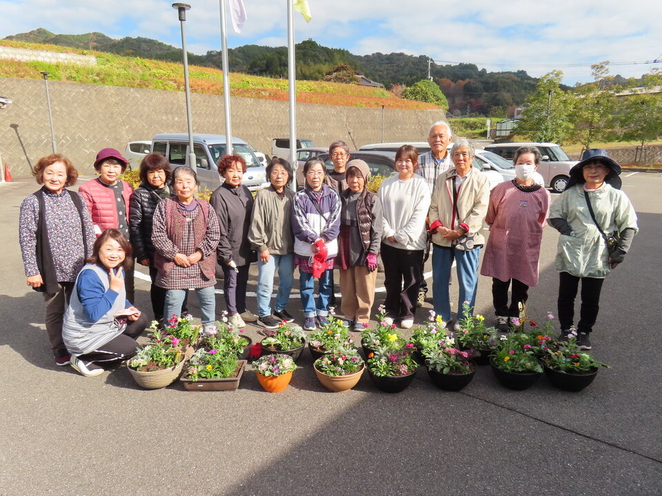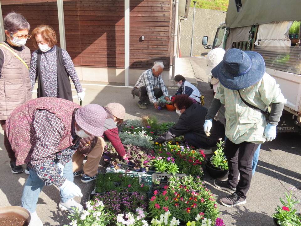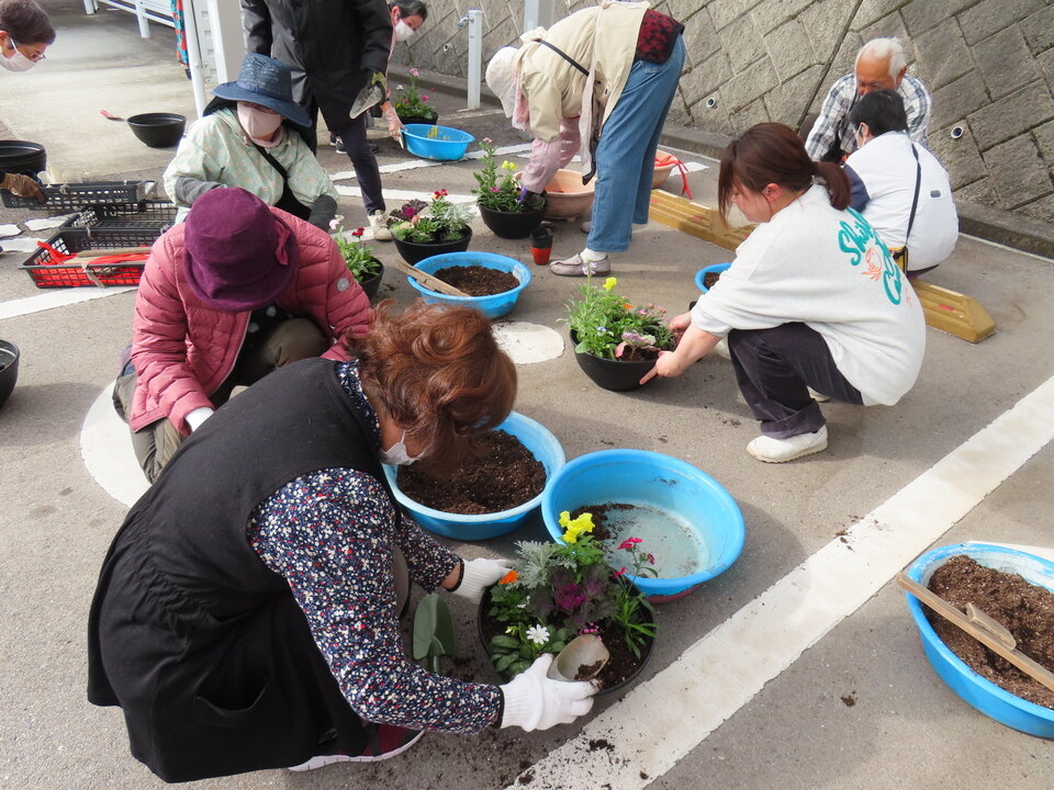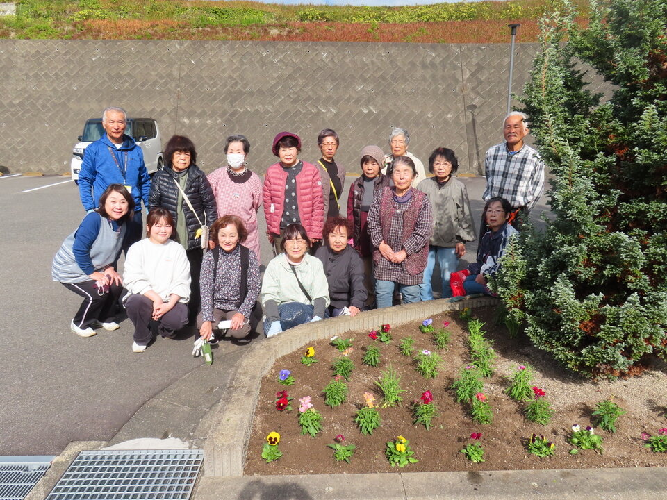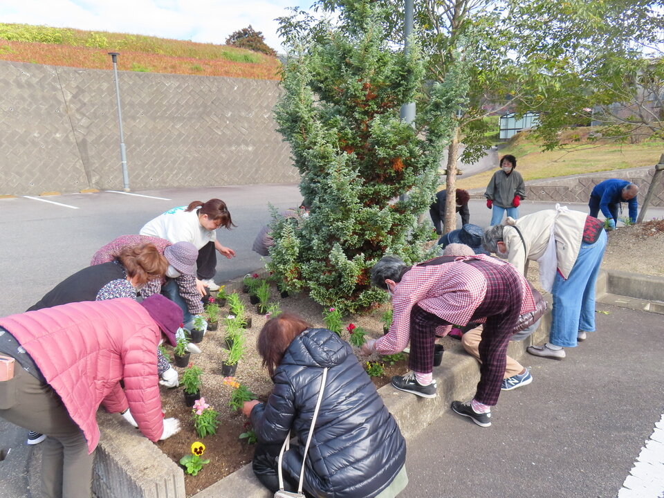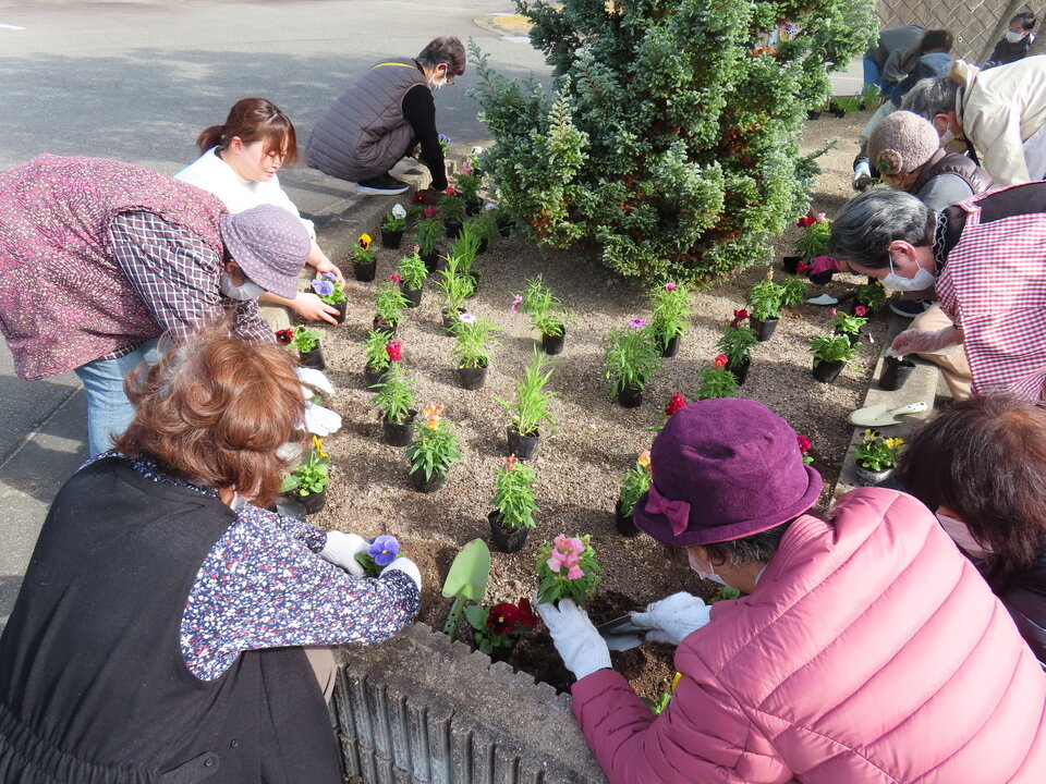 花壇は公民館駐車場入口にあるだけに"公民館の顔"となります。今回は、パンジー、ビオラ、キンギョソウ、ナデシコを全員で植えました。お陰様できれいに並べることができました。満開に咲いた花壇を早く見たいものです。