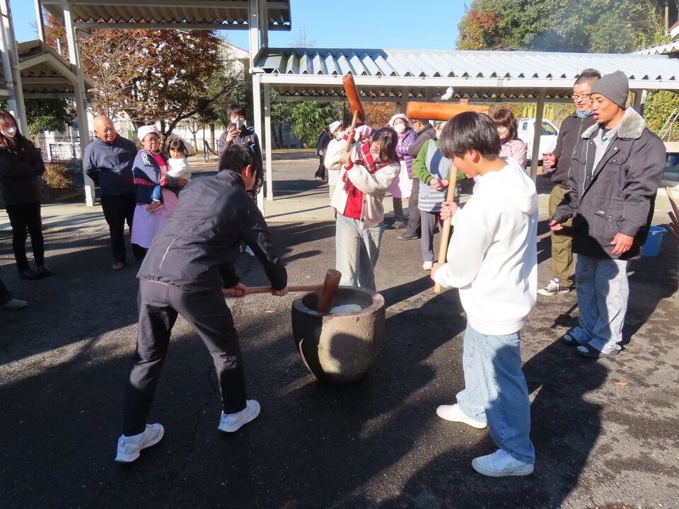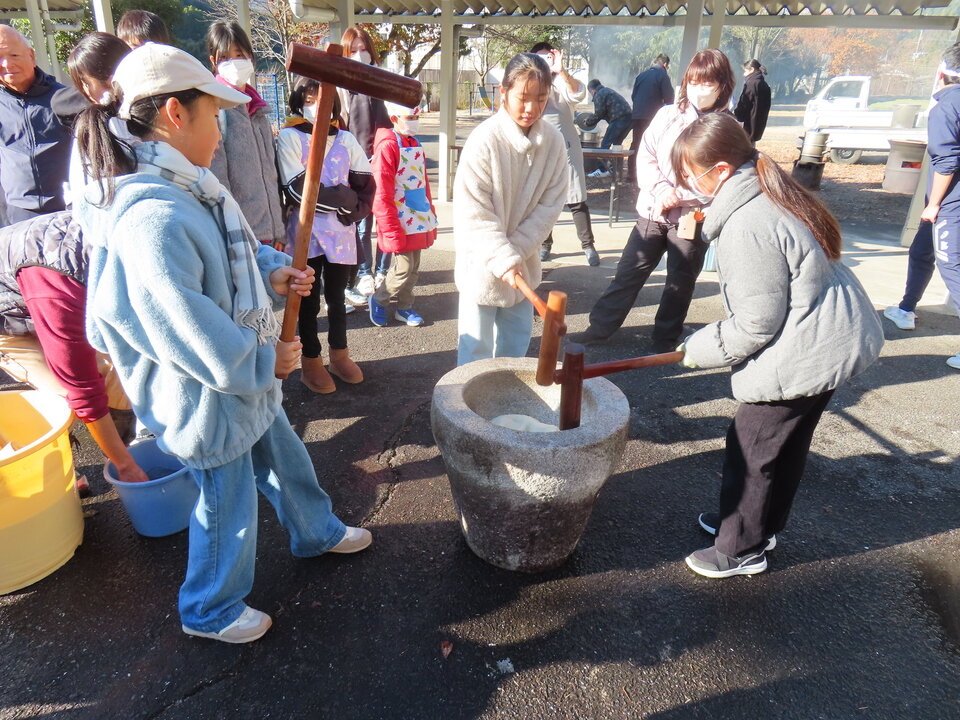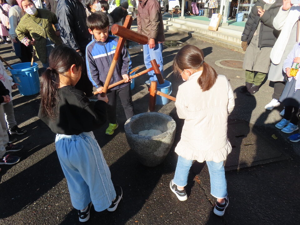 餅つき体験では、子どもたちが元気いっぱいに杵を振るい、周囲からは温かい声援と笑顔があふれていました。