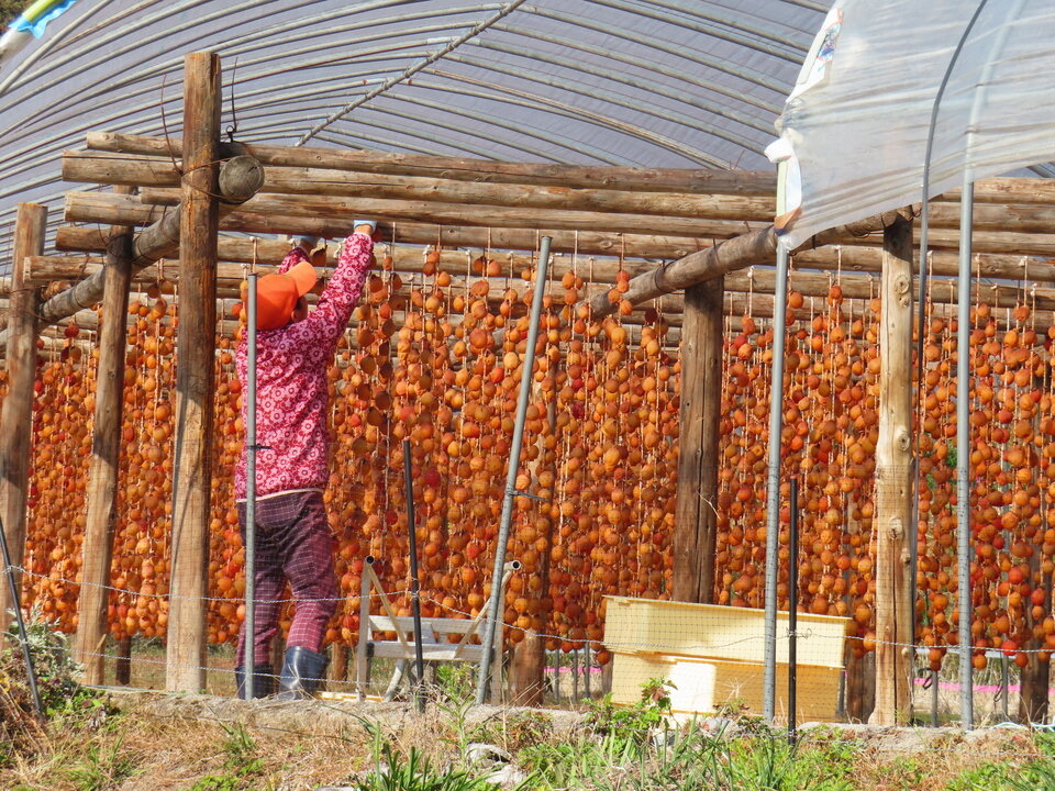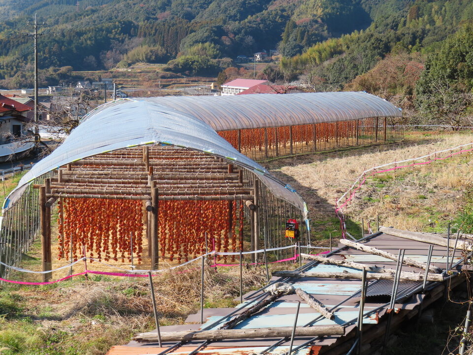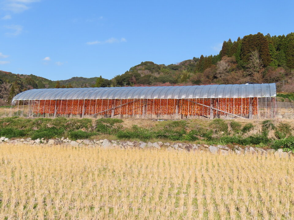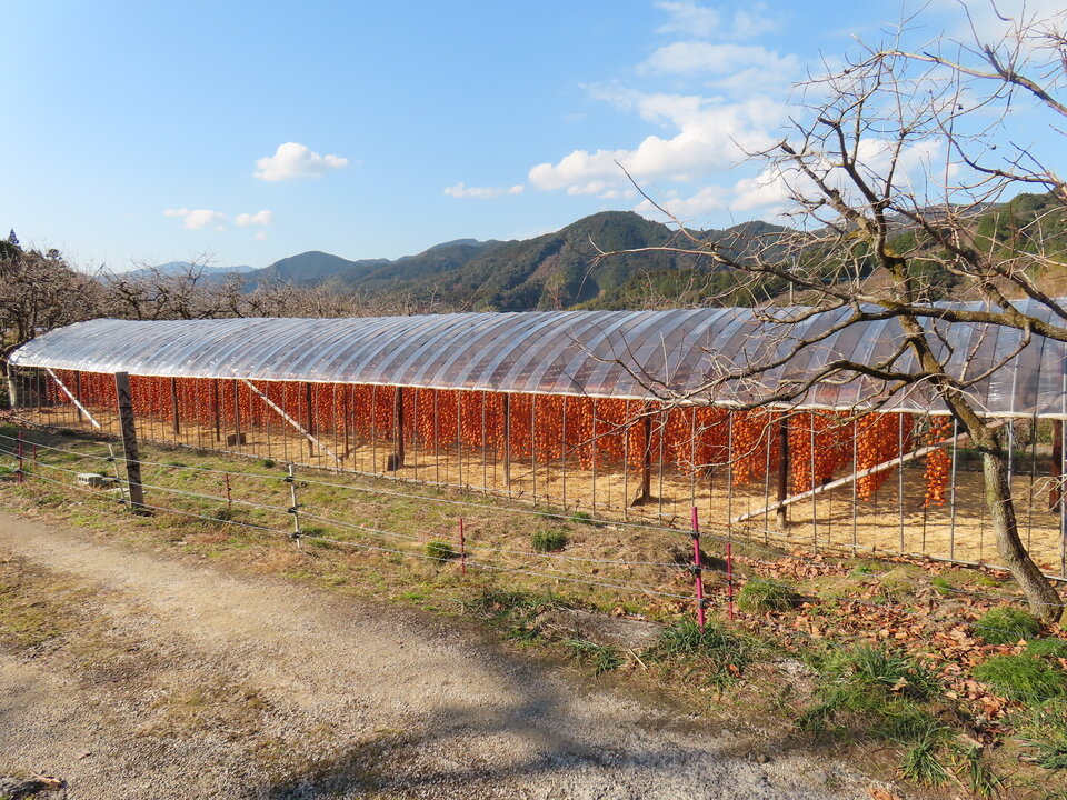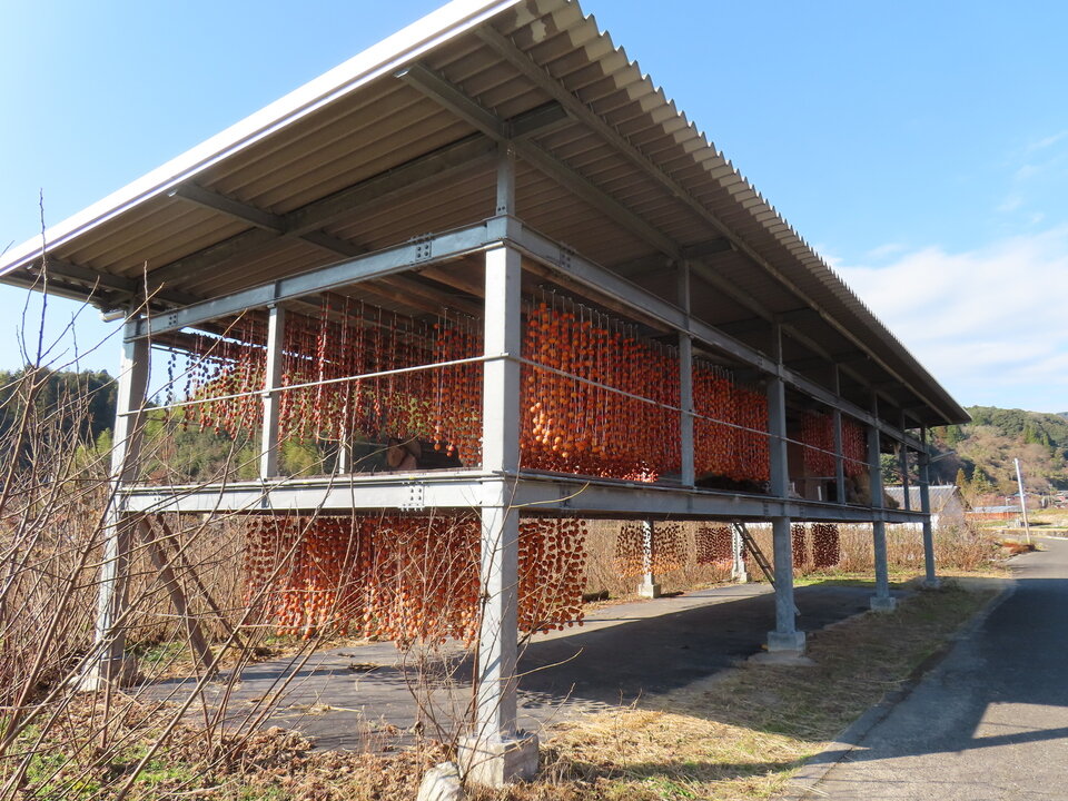 干し柿小屋は、収穫した熟柿の皮を剥き、縄に吊るして自然の風と寒さを利用し、おおむね1か月ぐらいの時間をかけて甘みを引き出すための小屋です。この小屋の中には、地域の人々が手作業で柿の世話をしながら、代々受け継がれた知恵と工夫を守り続けた干し柿が吊るしてあります。