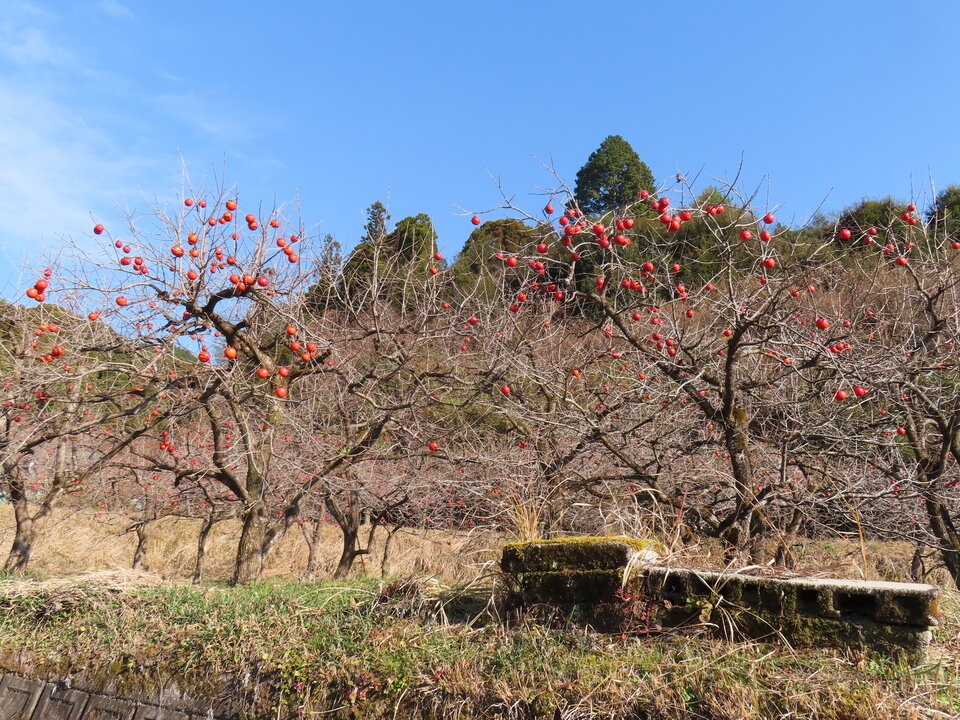 松梅地区では、秋から冬にかけて昔ながらの方法で干し柿づくりが行われています。特に小中一貫校松梅校付近から名尾方面にかけて干し柿小屋を見ることができます。また、民家の軒先に干し柿が吊るしてある風景も見ることができます。まさに松梅の秋・冬の風物詩となっています。