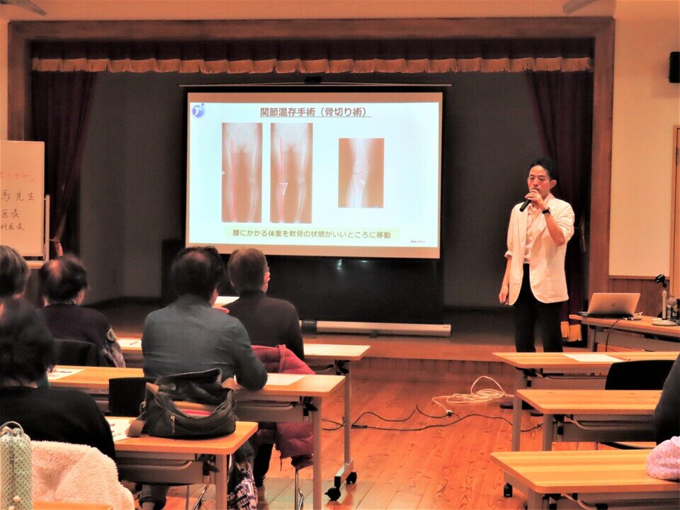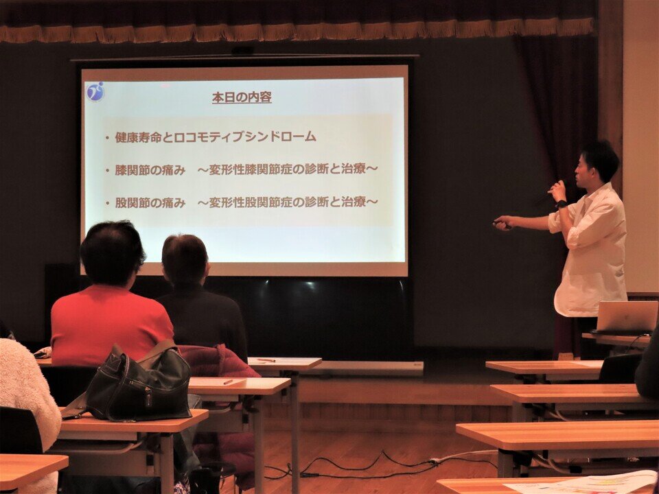 講話のメインとなる股関節・膝関節については、変形性関節症の仕組みや、痛みが起こる原因、治療法について分かりやすい説明があり、参加者の皆さんは熱心に聴講されていました。