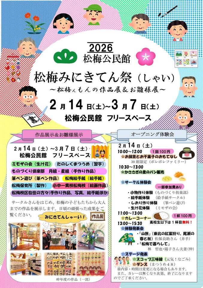 期間は2月14日(土)〜3月7日(土)(休館日は除く)で、公民館サークルをはじめ、松梅の子どもたちから大人までの作品を展示します。