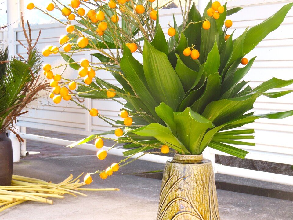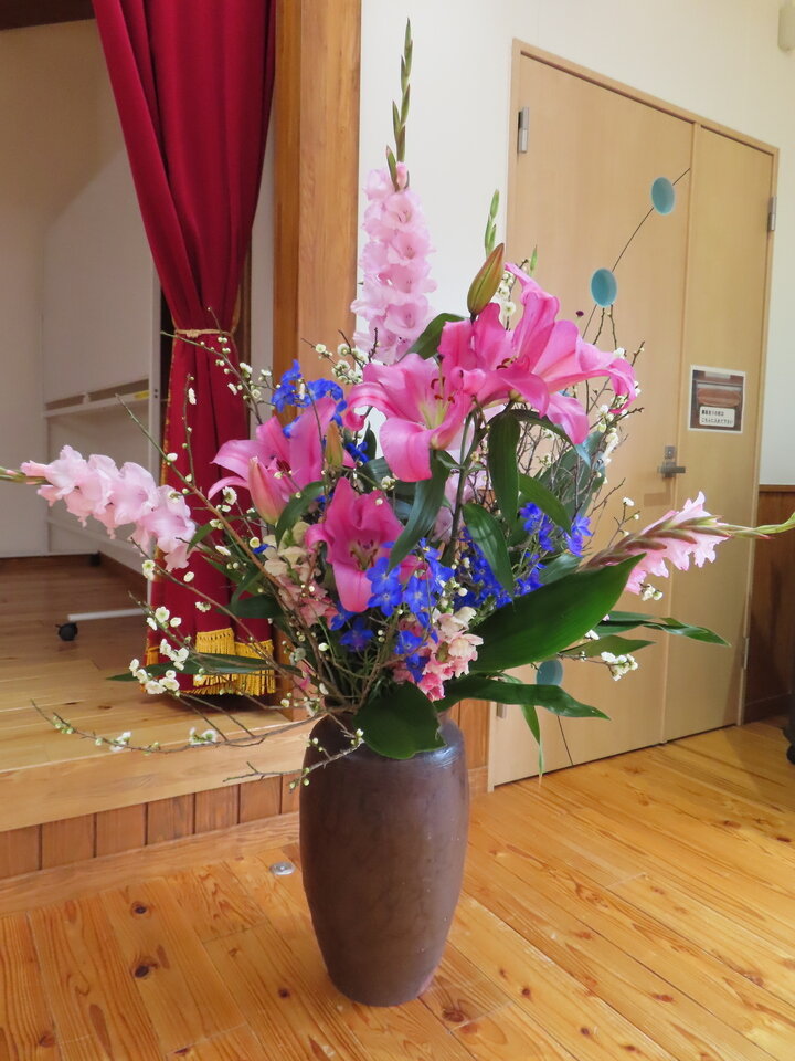 公民館玄関前に来ると、豪華さの中にも野趣あふれる「ミモザの会」による生花の作品の数々がお迎えしてくれます。