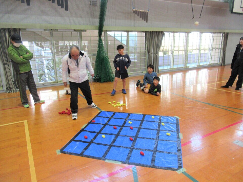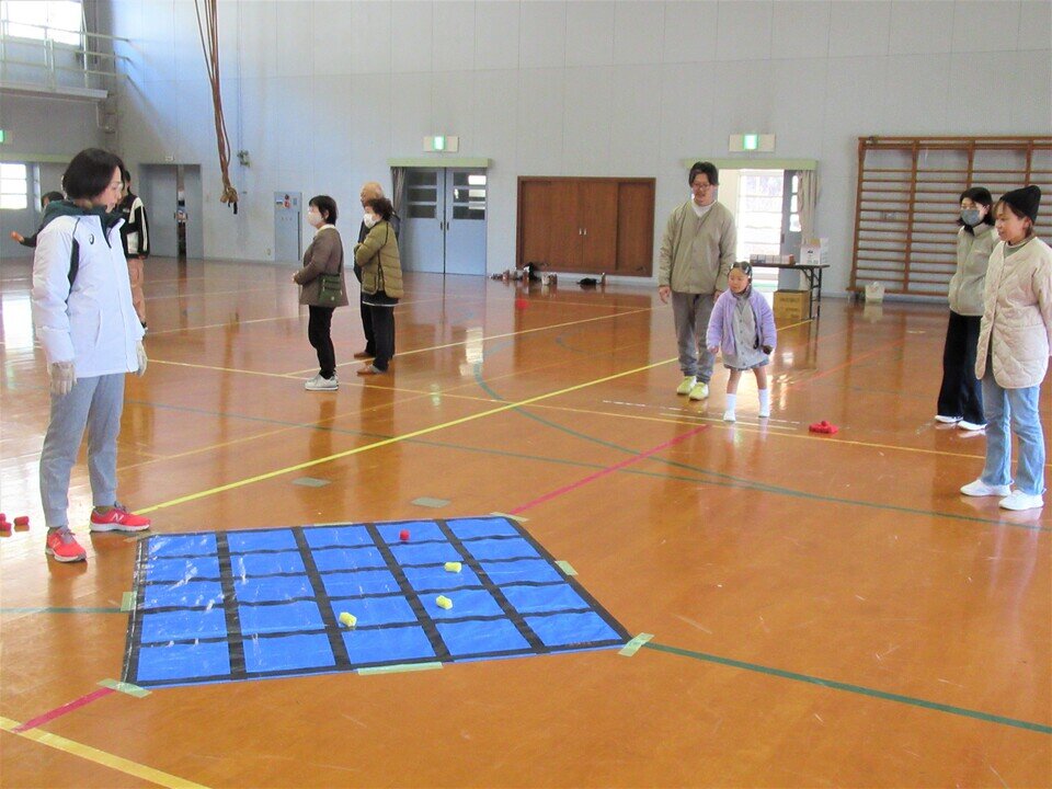いごてだまは、マス目のシートにお手玉を投げ入れ、縦・横・斜めに並べて得点を競うニュースポーツであり、ルールが簡単で誰にでも気軽に楽しめる競技です。