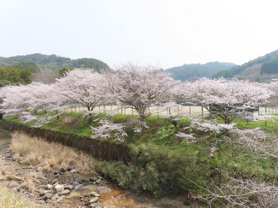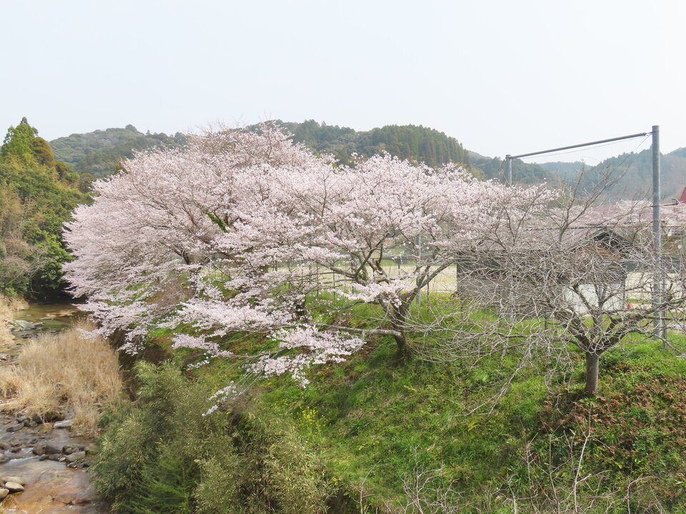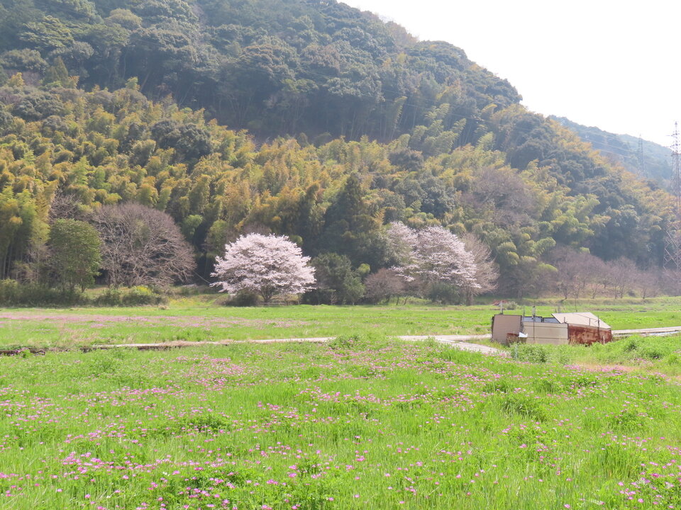 田畑はれんげがピンク色に広がりつつあり、あぜ道にはつくしや野の草花が顔を出します。里山の季節の移ろいを感じます。その中の2本の桜はまだまだ鮮やかです。