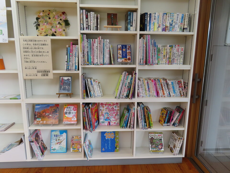 松梅公民館のフリースペースに佐賀市立図書館大和館から借り入れた本220冊を並べています。子ども達の要望も聞いた上で、幼児向け絵本から高齢者や女性向けの実用書まで、一冊一冊手にとって選びました。その一冊一冊に新しい出会いがあるように願っています。
