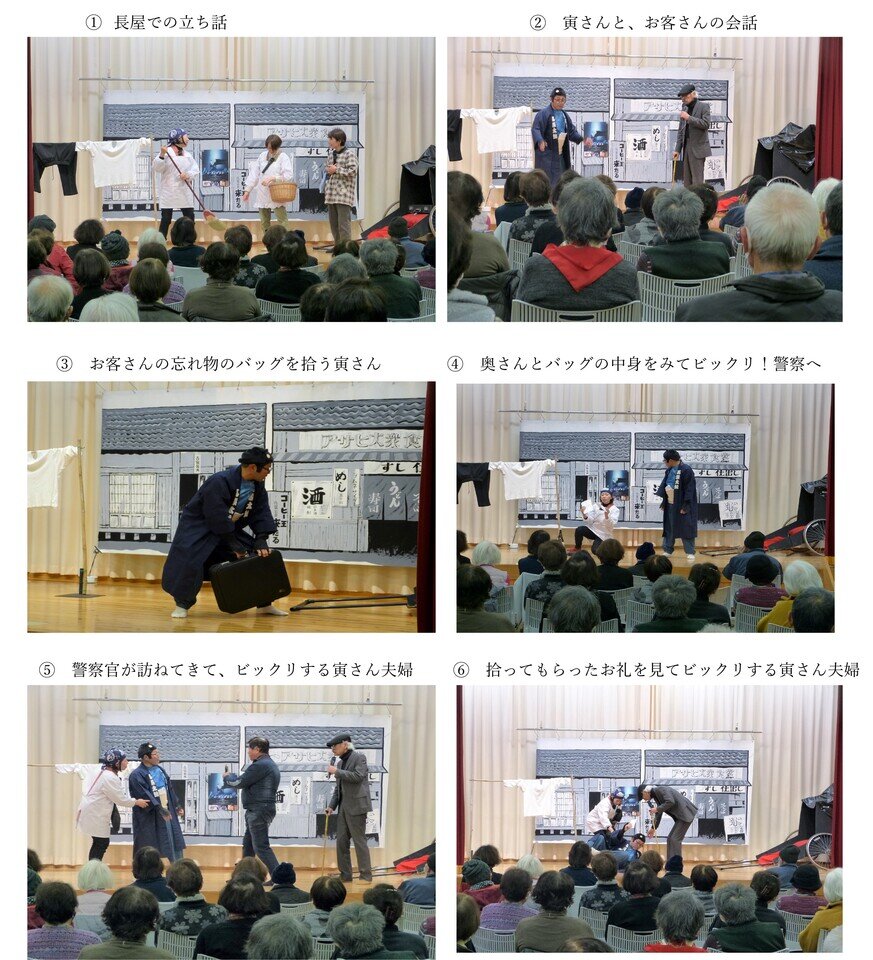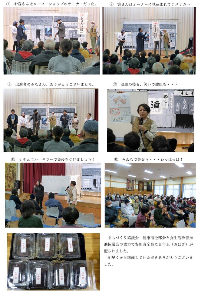 1月16日(木)に劇団「希望」を招き、筑紫美主子さんの十八番『運の車屋』を演じて頂きました。主人公の寅さんほか7人の団員の方々の演技に、参加者は笑いの渦につつまれました。演劇の後は健康体操を行い、笑って免疫力UP(つくり笑いでもいいから笑いましょう)の指導を受けました。 また、まちづくり協議会健康・福祉部会、食生活改善推進協議会の協力で、参加者にお年玉(おはぎ)が配られました。思わぬ美味しいお年玉に参加者はたいへん喜ばれていました。