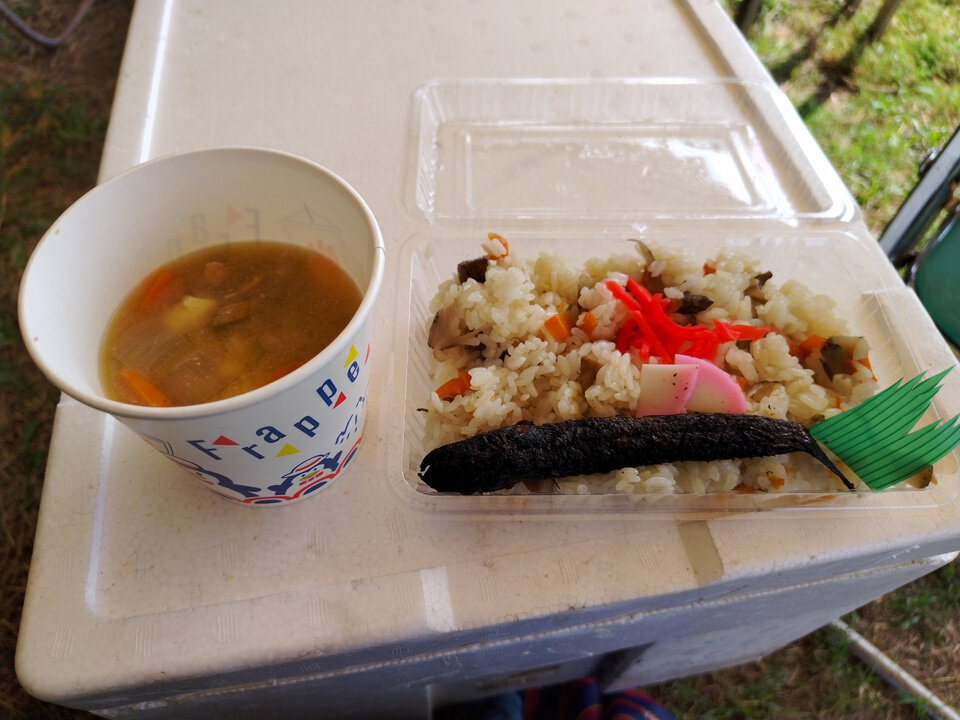南川副女性会は会場で、かしわ飯や豚汁等を提供されていたのですが、そのかしわ飯に1匹の魚を付けられています。実はこの魚、あのムツゴロウです。毎年、地元の漁師である藤戸貞人さんから頂いて、サービスで付けてあるとの事。近年はムツゴロウの数も減っているため、来年は食べられないかもしれません。