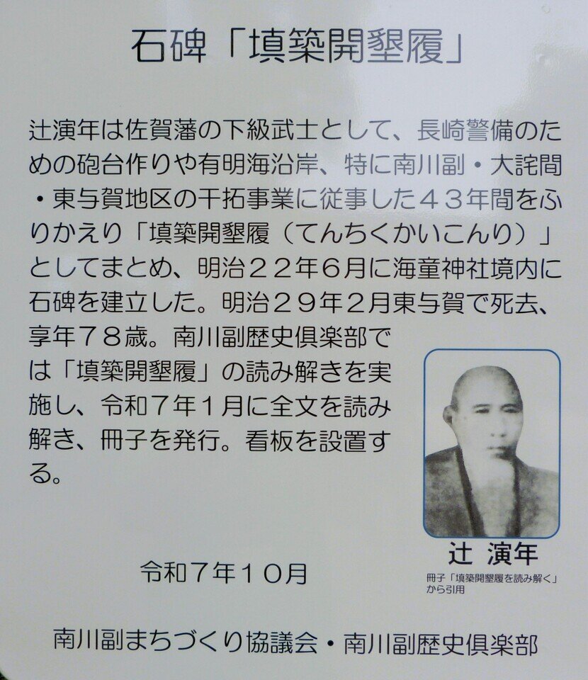 南川副歴史倶楽部では、読み解き冊子だけでなく海童神社境内に填築開墾履の案内看板が必要と考え、南川副まちづくり協議会と共同で2025年10月に看板を設置しました。