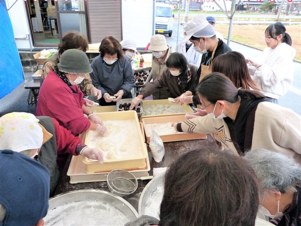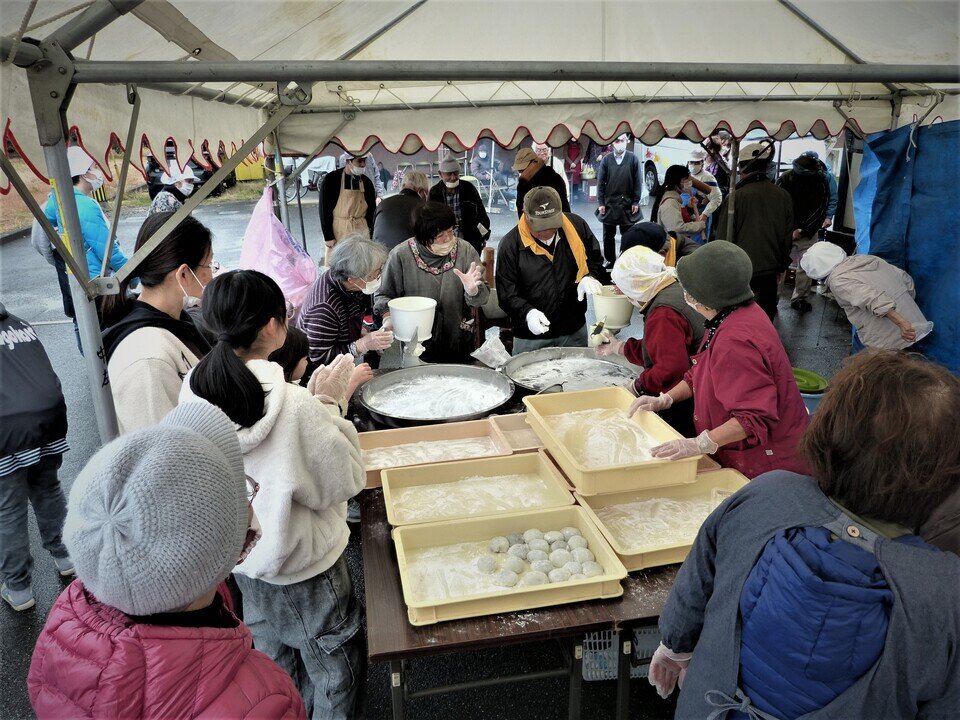 お餅を丸めたり、あんこを入れたり、きなこをまぶしたり。ひとしきり加工をしたあとには炊き出しごはんで一息。炊き出しには、豚汁、おにぎり、お漬物などが準備されており、みんな和やかに食事を楽しまれていました。