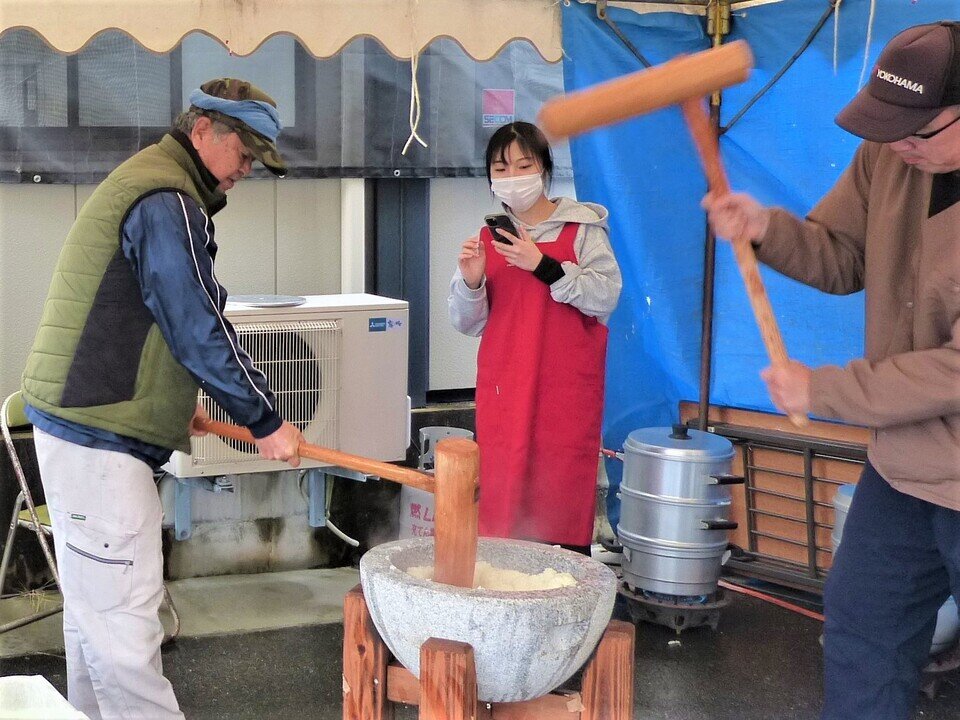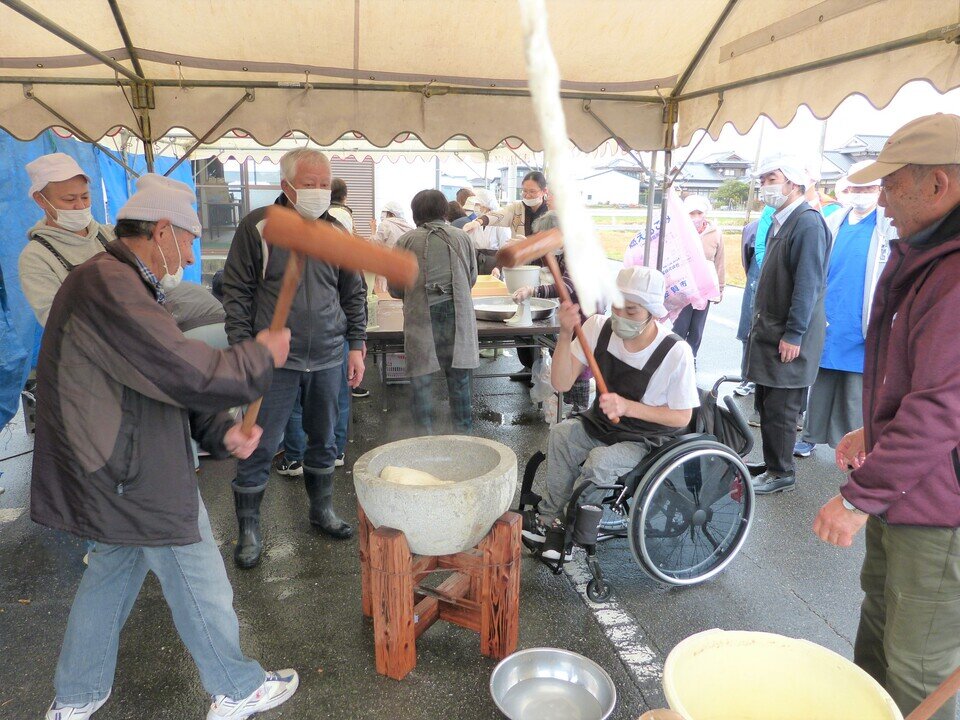 まごころ会は、南川副にある障がい者支援を行っている団体です。昨今見かけない杵と臼を使った餅つきには、施設の利用者さんや冬休みに入ったばかりの子どもたちも参加していました。