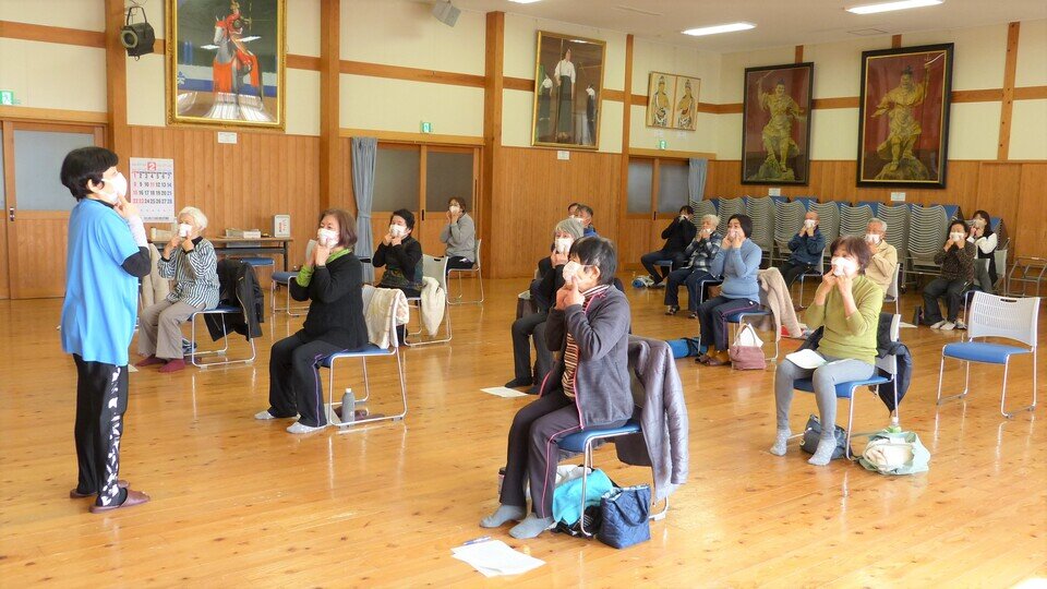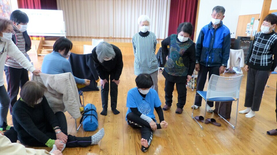 まずは、体を整えるために顔こすりと足もみから教えていただきました。両日ともに朝は寒く、皆さんいかにも冷えているといった顔色で講座に参加されていましたが、顔こすりが終わるころには、頬にチークをされたのかな?と思うほど、血色がよくなられていました。足もみが終わるころには、心もほぐれて来たのか、隣の方と教え合いをされている方もいらっしゃいました。
