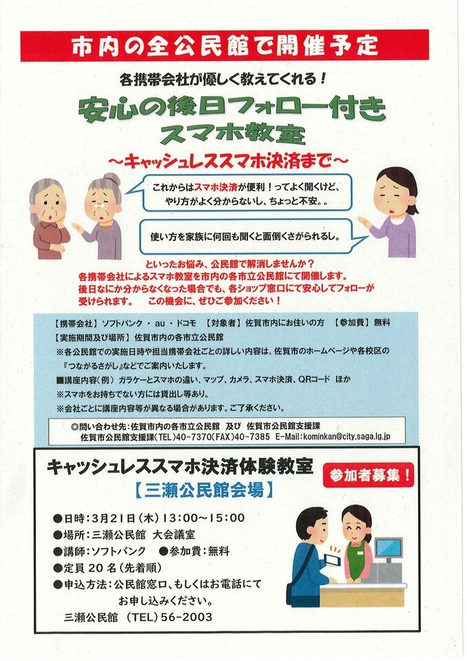 『これからはスマホ決済が便利!』ってよく聞くけどやり方がよく分からないし、ちょっと不安。使い方を家族に何回も聞くと面倒がられる。といったお悩みを解消しませんか? 携帯会社によるスマホ教室・キャッシュレス決済を開催します、後日なにか分からなくなった場合でも、各ショップ窓口で安心してフォローが受けられます。