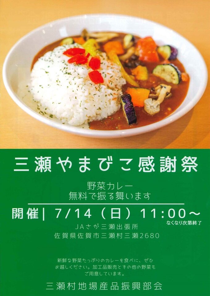 当日、午前11時から「JAさが三瀬出張所:佐賀市三瀬村三瀬2680」において、"野菜カレー"が無料で振る舞われます。(※カレーはなくなり次第終了)