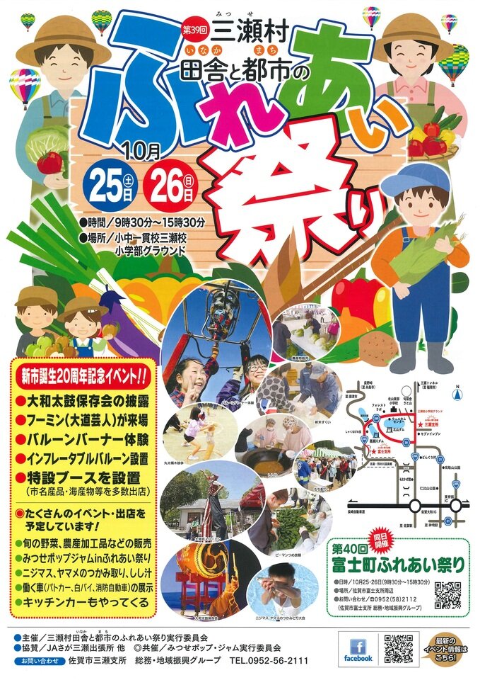 バルーンバーナー体験、働く車(パトカー、白バイ、消防自動車)展示、ニジマス・ヤマメのつかみ取り、新米すくい、しし汁、もち配り、みつせポップジャムinふれあい祭り、キッチンカー、特設ブース(市名産品・海産物等)の設置、旬の野菜・農産加工品販売など、楽しいイベント・出店が盛りだくさんです。