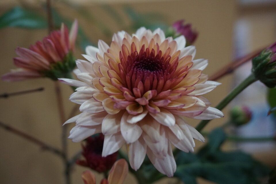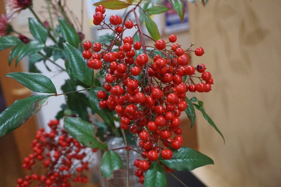 丙午(ひのえうま)の令和8年(2026年)がスタートしたかと思えばもう立春、三瀬では年明けに降った雪がまだ日陰に残っています。三瀬公民館では村内在住の無津呂幸子さんが館内に素敵な花を飾ってくださいました。 飾ってくださる花はご自宅の庭に咲いているものとのこと。来館者はこの花で三瀬の季節を感じることができます。今回は「ナンテン」と「キク」と「モミジ」を飾ってくださいました。 いつもきれいなお花をありがとうございます。