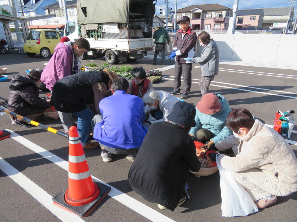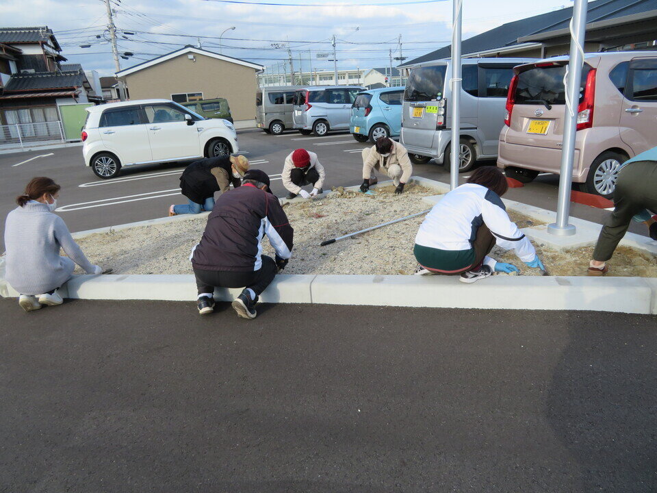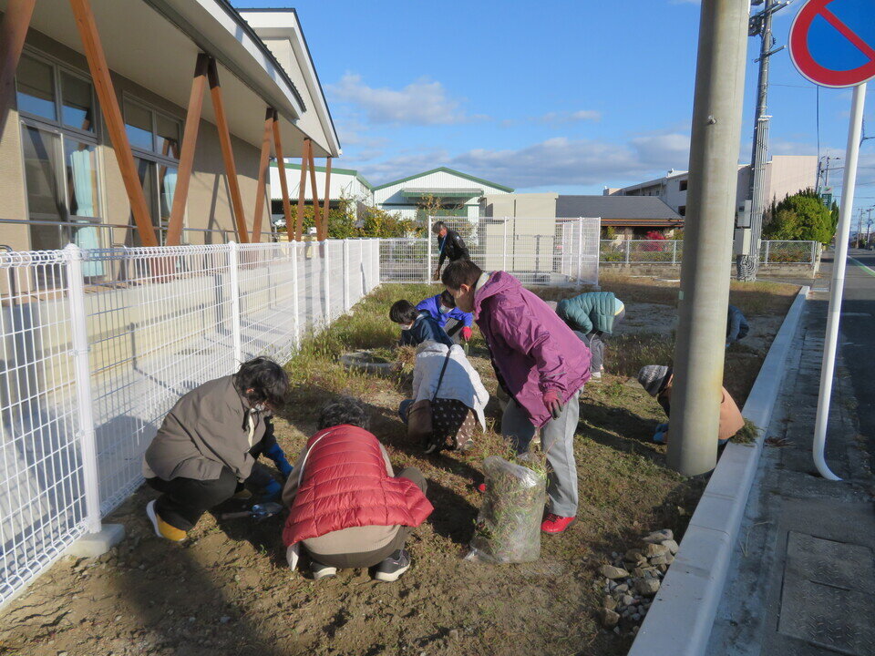 寄せ植えが終わった後は、公民館植栽予定地の除草作業と石拾いです。