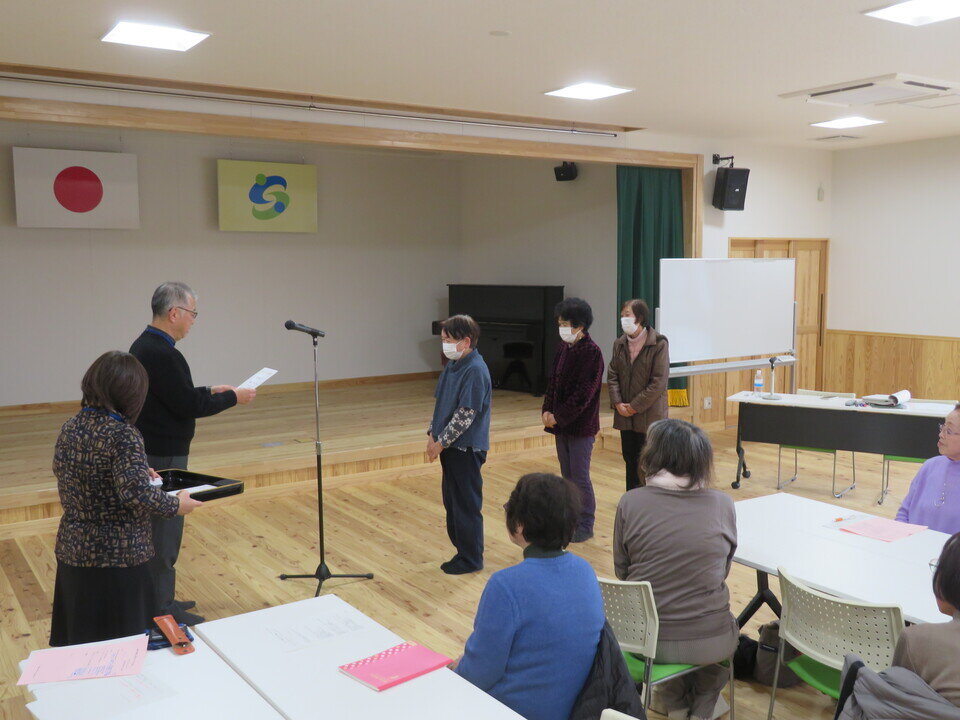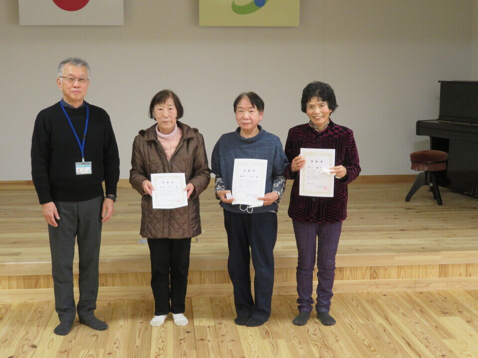 今回がいきいき大学の最終回ということで、皆勤賞の3名に館長から賞状と賞品をお渡ししました。