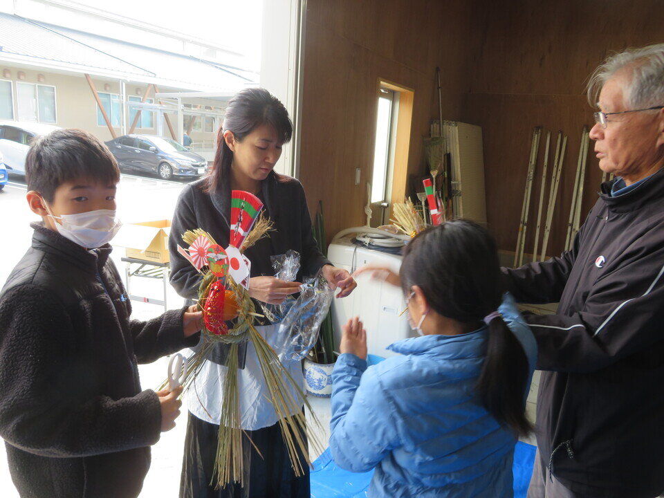 令和7年12月20日に、本庄の島尊さんを講師に招き「おやこdeしめ縄づくり体験」を開きました。しめ縄を3本で編む理由、だいだいや海老を飾る理由などを説明していただきました。四人一組となって締め上げていきます。四人一組ですので、となり同士の家族で協力しながら和気あいあいと締め上げて完成しました。最後に玄関の向きによって飾る方向があることを教わりました。皆さん自分が作ったしめ縄に満足した笑顔が新年の福を呼ぶことでしょう。