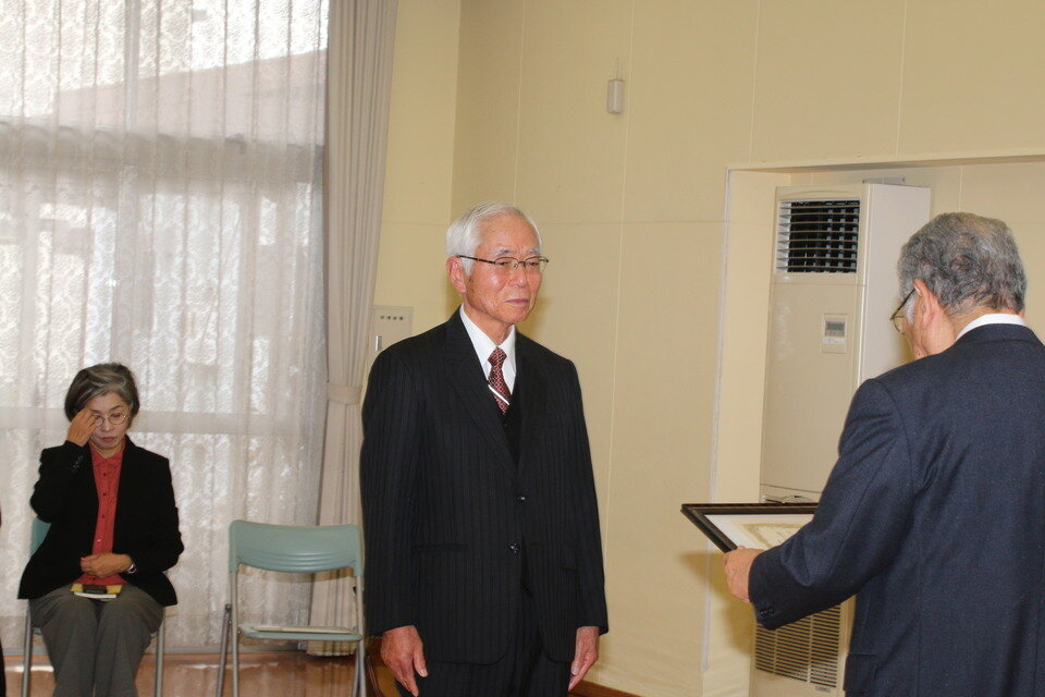 まち協江頭会長が審査委員長 鍵山俊明氏から優秀団体賞の伝達を受ける