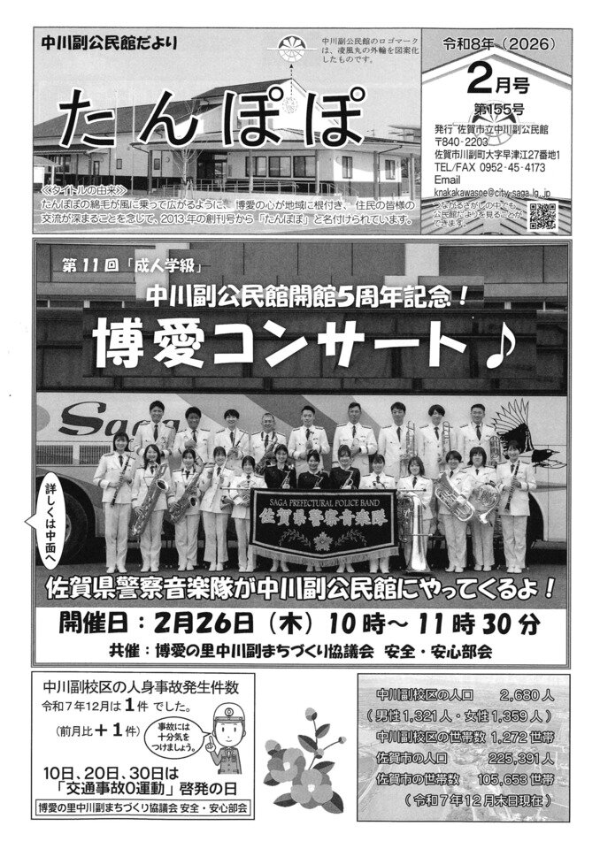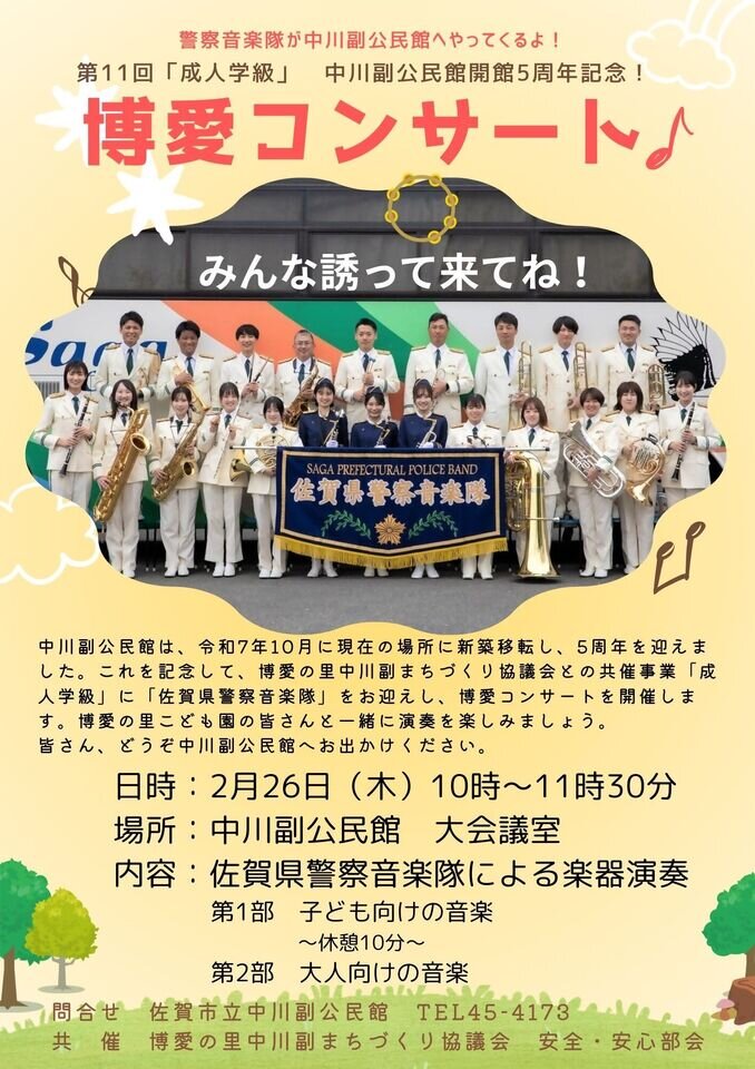2/26(木)博愛コンサート開催! 佐賀県警察音楽隊が中川副公民館にやってくる!