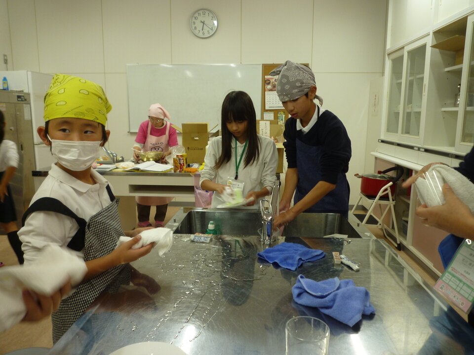 夕食作りでは、子どもたちが考えた献立の材料や分量を中川副食生活改善推進協議会の方達が考えてくださり、作り方を教えていただきながら、みんな手際よく材料を切ったり、盛り付けを行っていました。1時間ほどで調理を終え、出来上がった「カレーライス・サラダ・デザート」をみんなで楽しく美味しくいただきました。