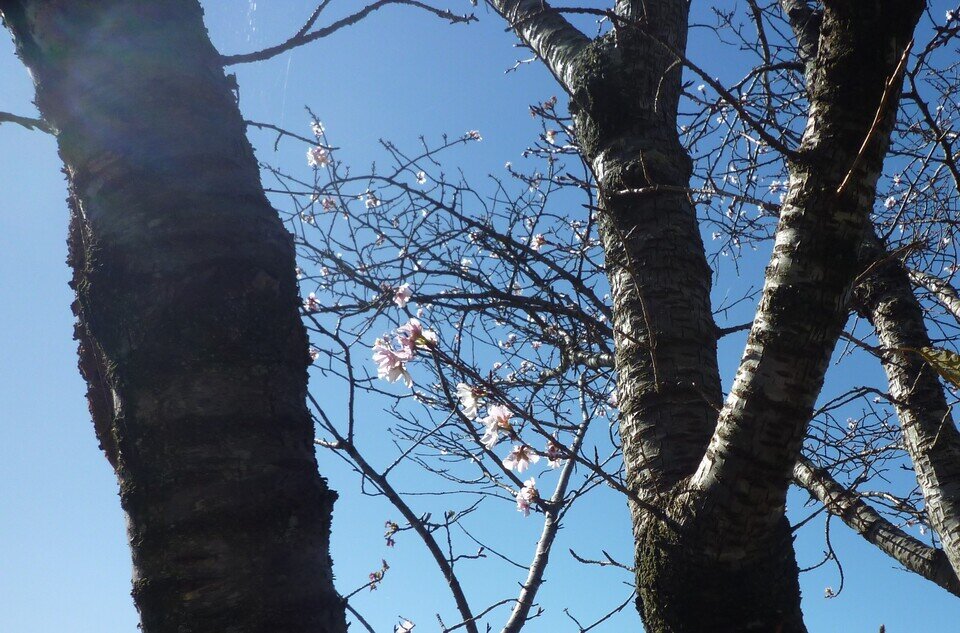 桜並木の下を通って歩いていると、桜の花がちらほら。春の穏やかな気候と勘違いしているのでしょうか。