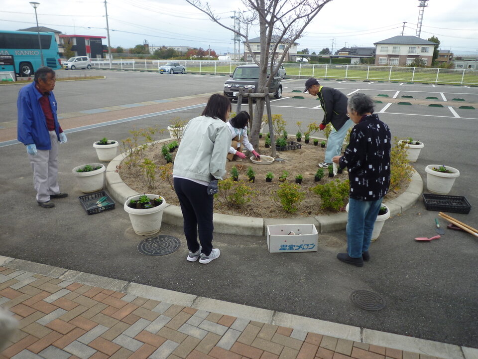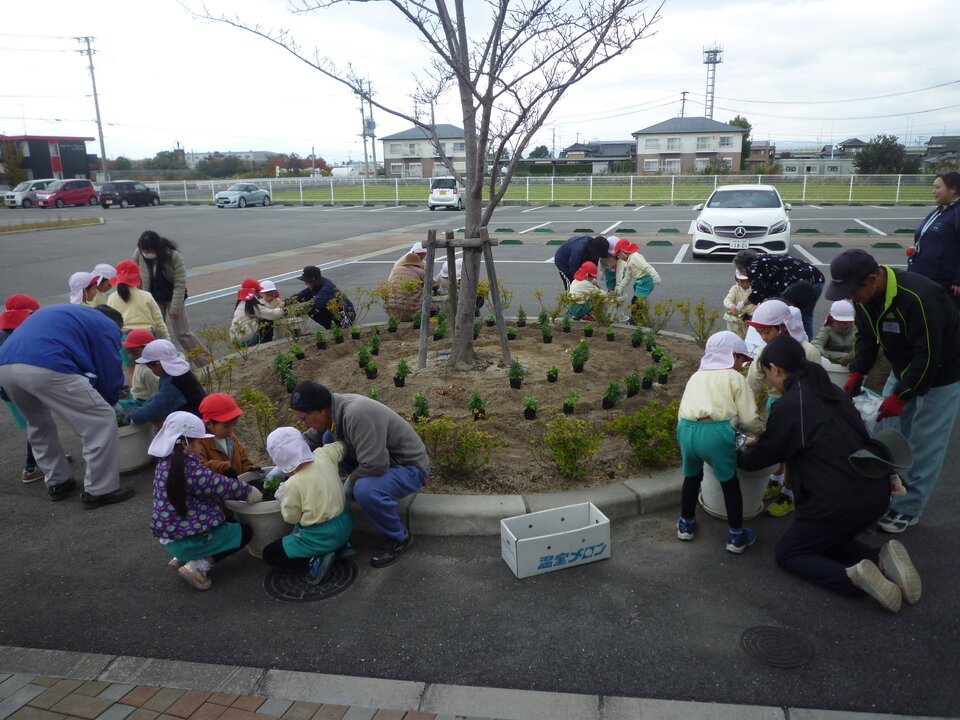 準備を整えて、たけの子くらぶのみなさんたちに挨拶をして、活動を開始します。プランターの周りに集まり、1つずつ丁寧に植えてくれました。プランターの植え込みが終わった子から、花壇の中のお花も順番に植えてくれました。可愛い子どもたちと一緒にたけの子くらぶのみなさんも終始笑顔で交流し、すてきな花壇をつくりあげてくれました。