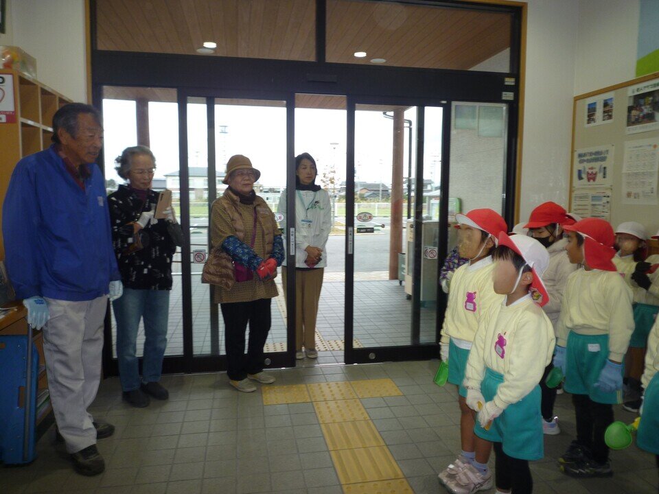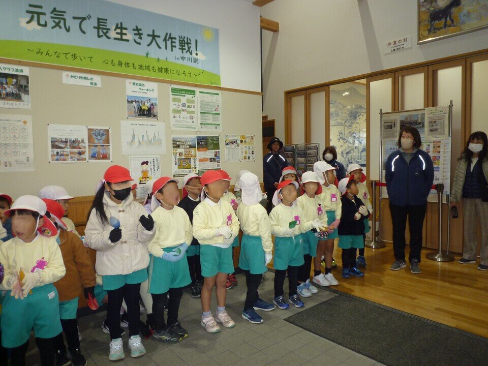 子どもたちは、こども園から歩いて公民館へ来てくれました。